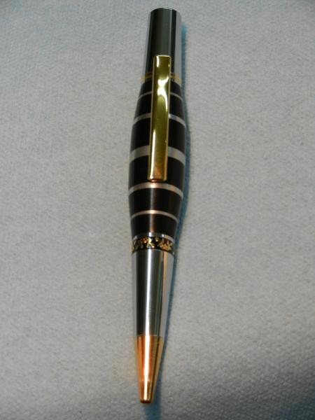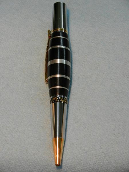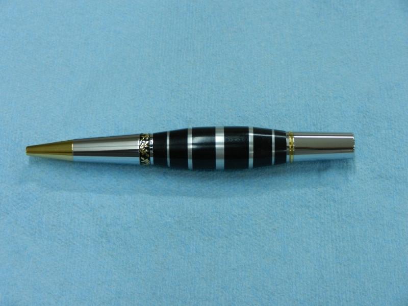 In Wiset1 post he mentioned he would like to see a pen with black & aluminum so I laminated this pen blank with Ebony and Aluminium. I used epoxy instead of CA and paired it with a Crafts USA ARTISIN AERO ball point kit I picked up at last years WOOD show. After it was assembled I liked it but not loved it, I should have turned it down a bit more in the middle however this is my first laminated or segmented pen and I was sorta in a hurry to see the black & chrome assembled. now that I know how to do it I'll pair it up in some form with a more expensive rollerball kit and pay closer attention to the shape.