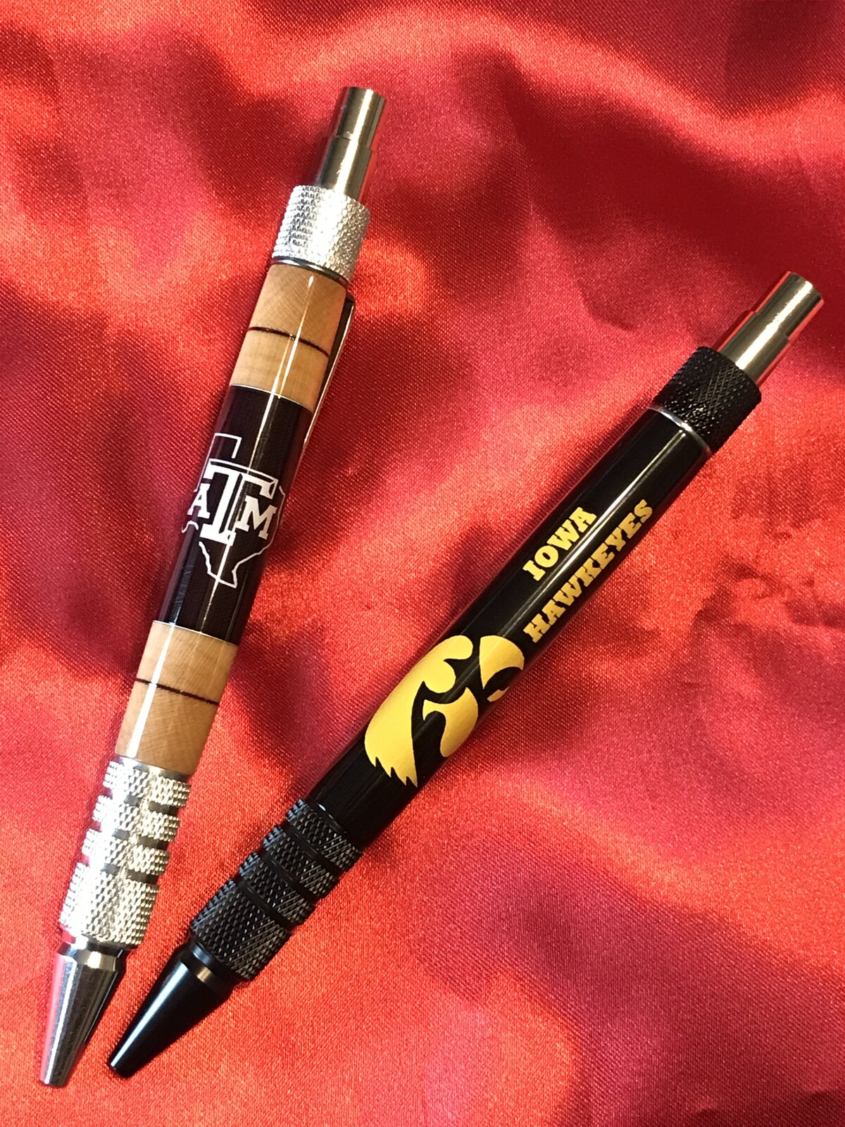 Just finished these up. I like the black background better than the yellow I did last time on the Iowa pen. The A&M I used aluminum above and below the logo to help go with the aluminum kit. The wood is from a basketball court floor they replaced last year at the university. The line in the middle of the wood pieces is the actual maroon paint that was on the floor. Both logos are vinyl on cotton cloth. Questions and Comments Welcome.