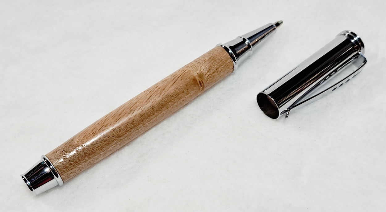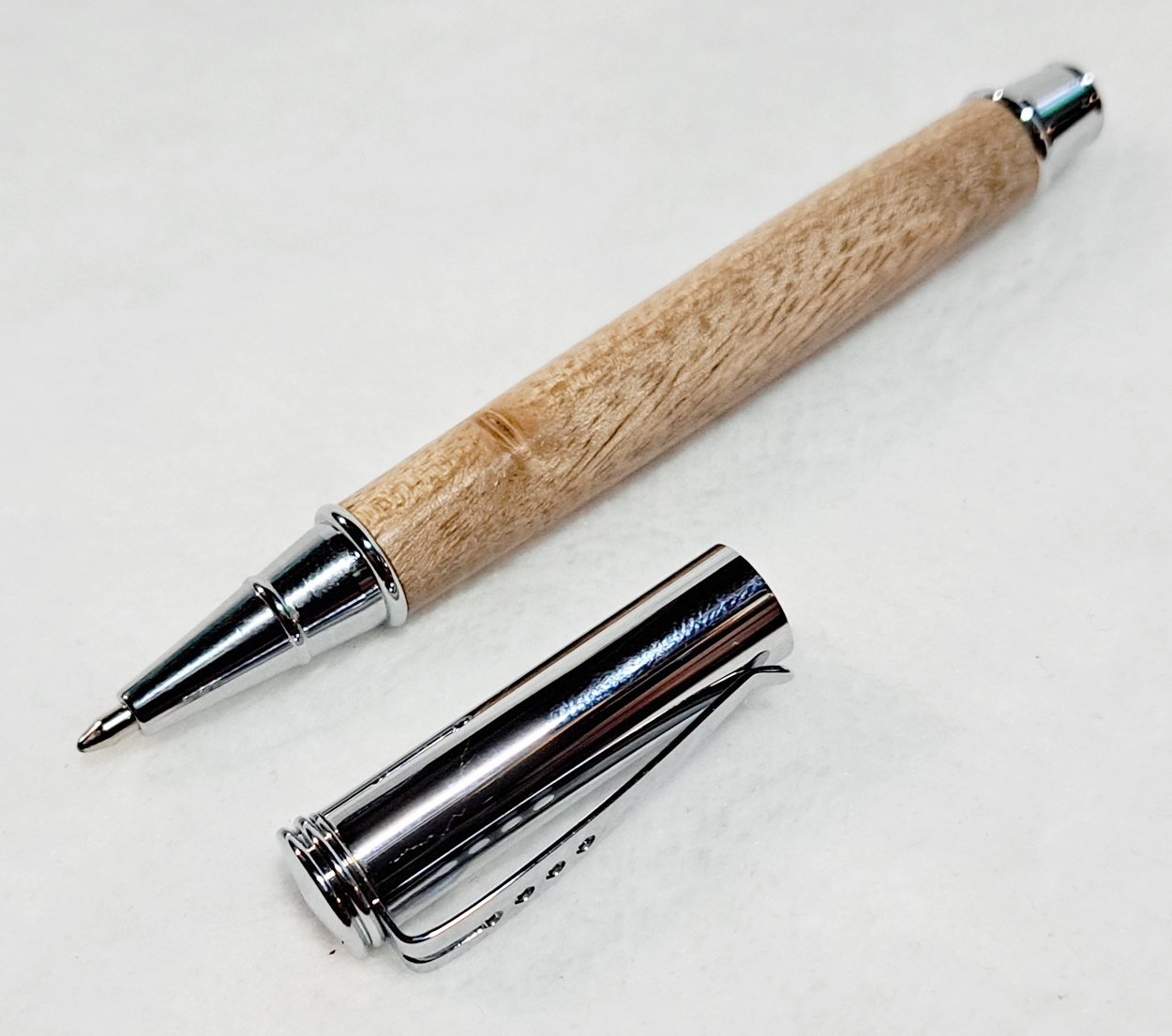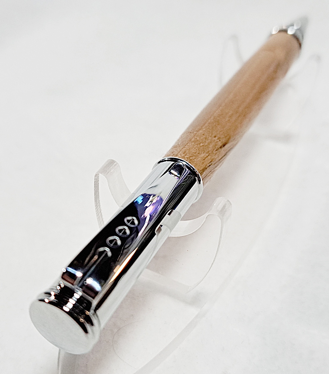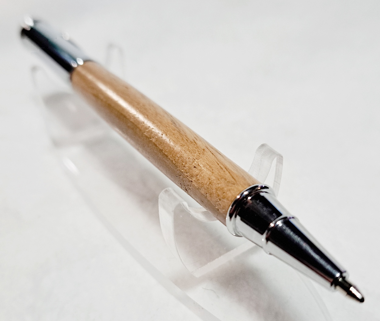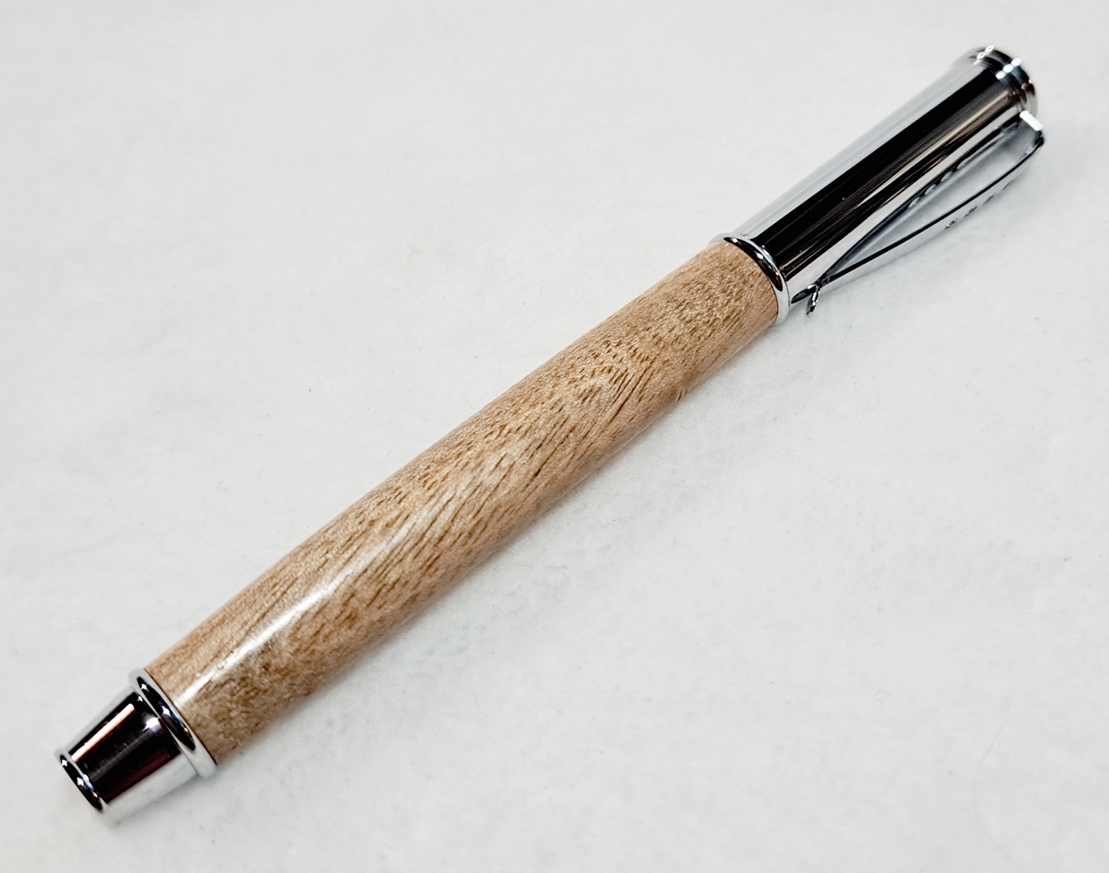 This is an Editor pen in chrome from Crooked Mill. The wood is black walnut. The finish is Mylands.
