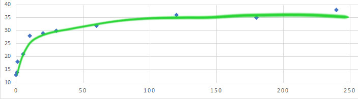 x-axis indicated minutes exposure. Results flattened out quickly; especially beyond 2 hours.