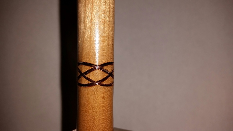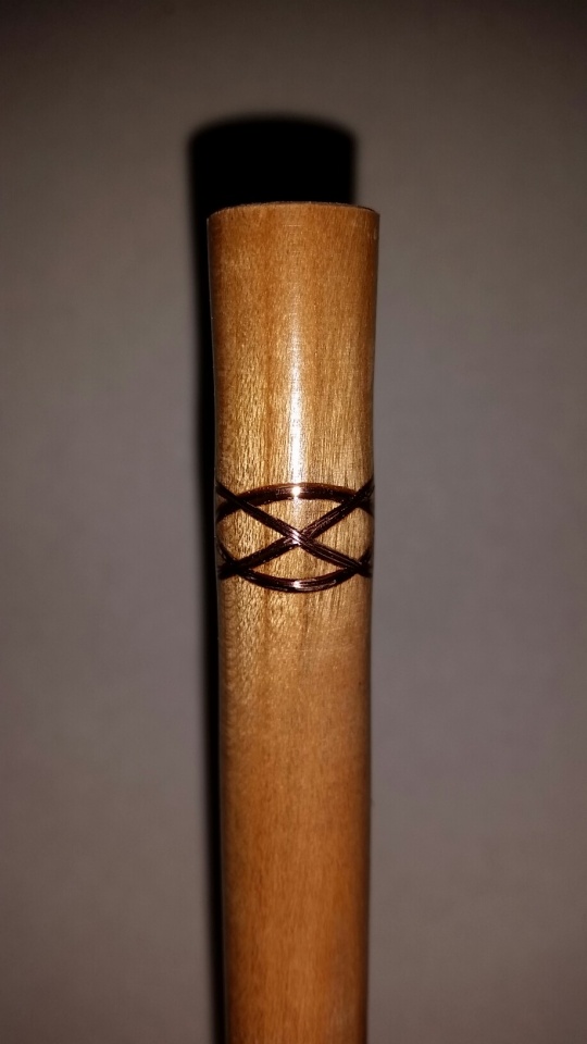 Even though the pics are a little dark, it appears to be well made with some nice amboyna Burl. The copper knot is clean, crisp and tight! A+ on the knot!