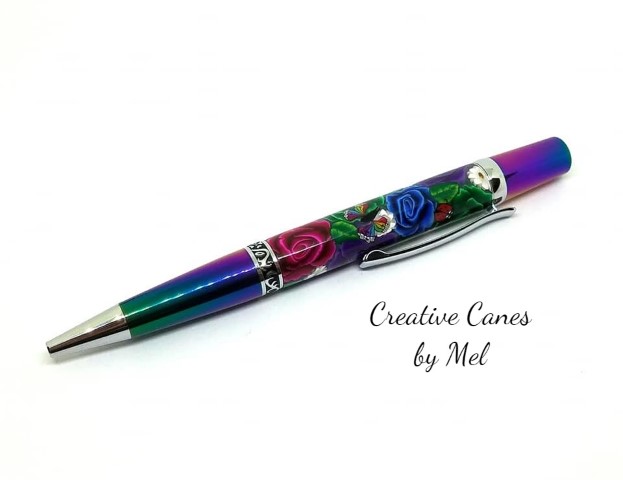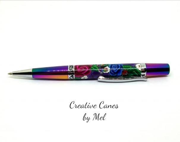 I used 4 different colored bold roses, I had to make the purple rose cane on the spot as the ones I had made previously weren't dark/bold enough. A two toned leaf, rainbow butterflies and lady bugs with some little white flowers to break up the bold colors.