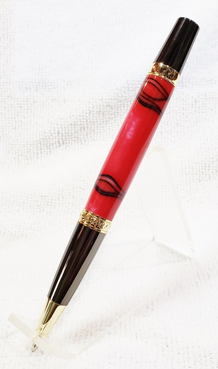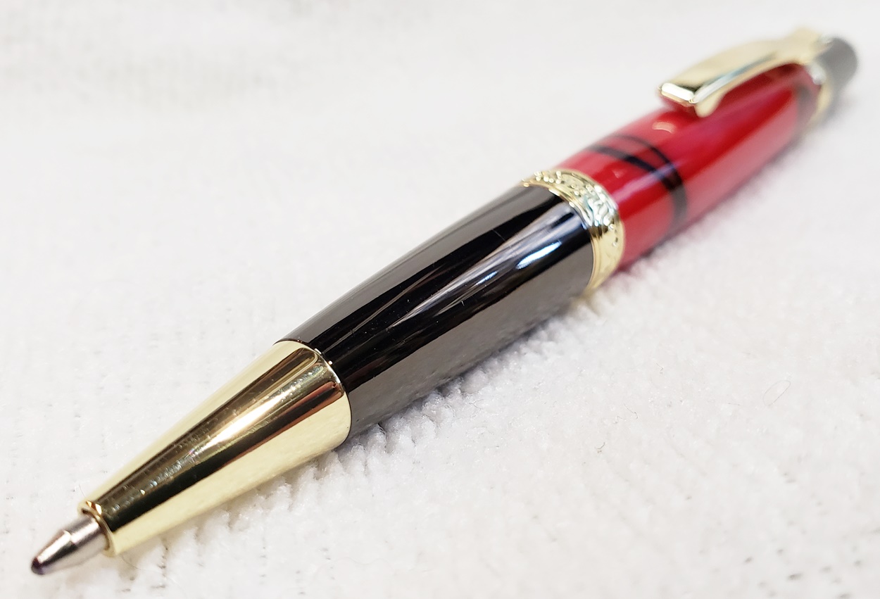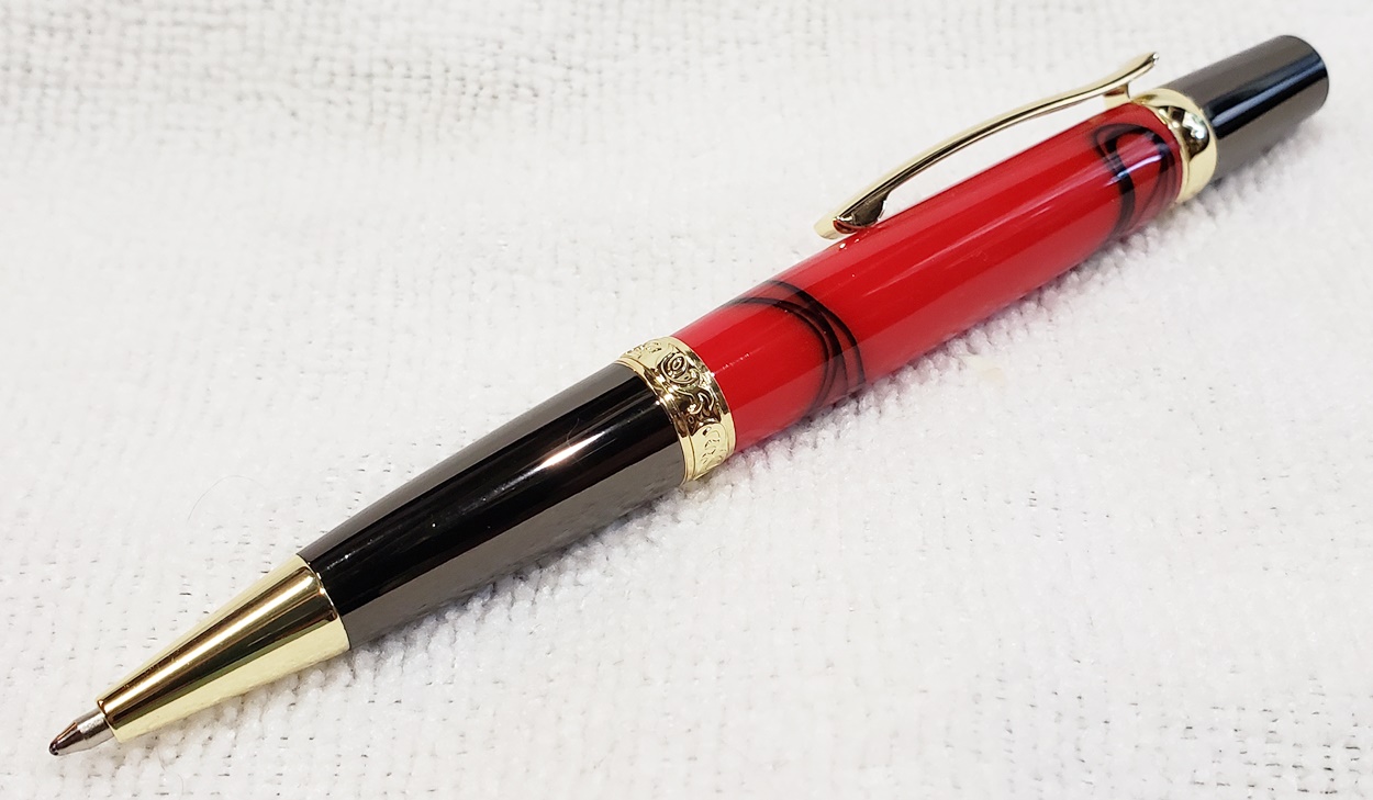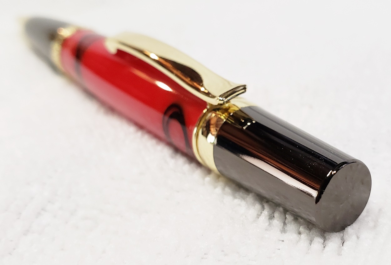 This is an Elegant Monarch in gold and gunmetal from Turners Warehouse. The blank is an AA called Cherry with Rose Swirl, from PSI. I'm immensely disappointed with the blank. Almost all the "figure" got turned away. I was hoping there was something hidden inside, but alas, nothing. Not a bad looking pen, but should have been better, in my opinion.