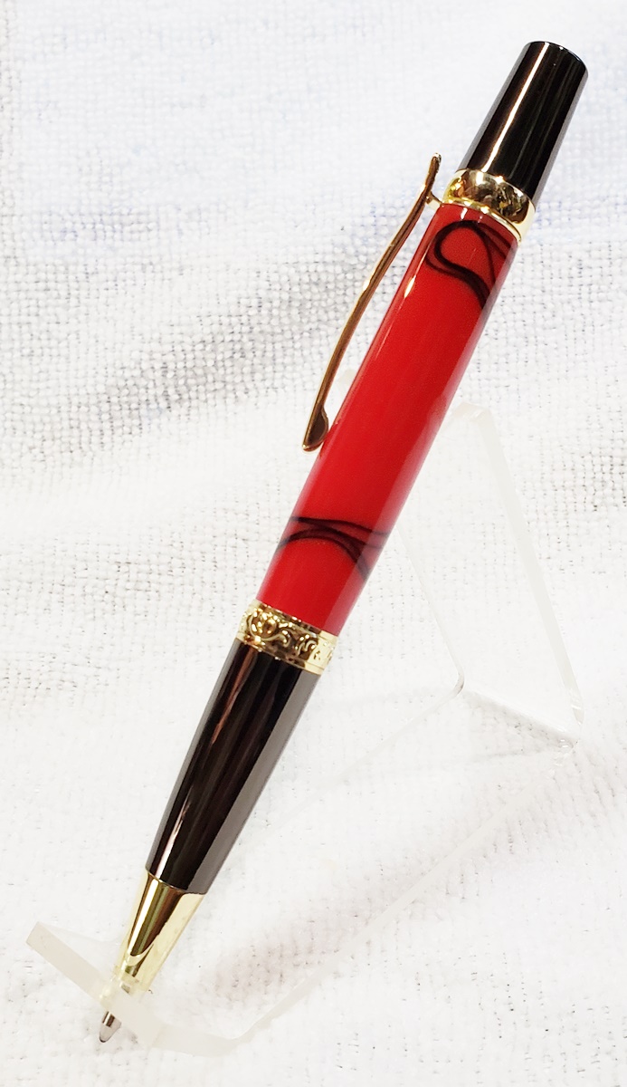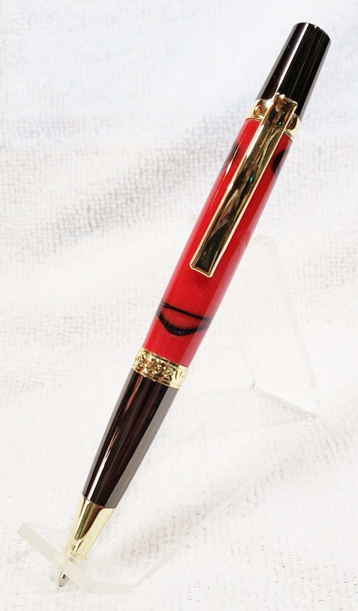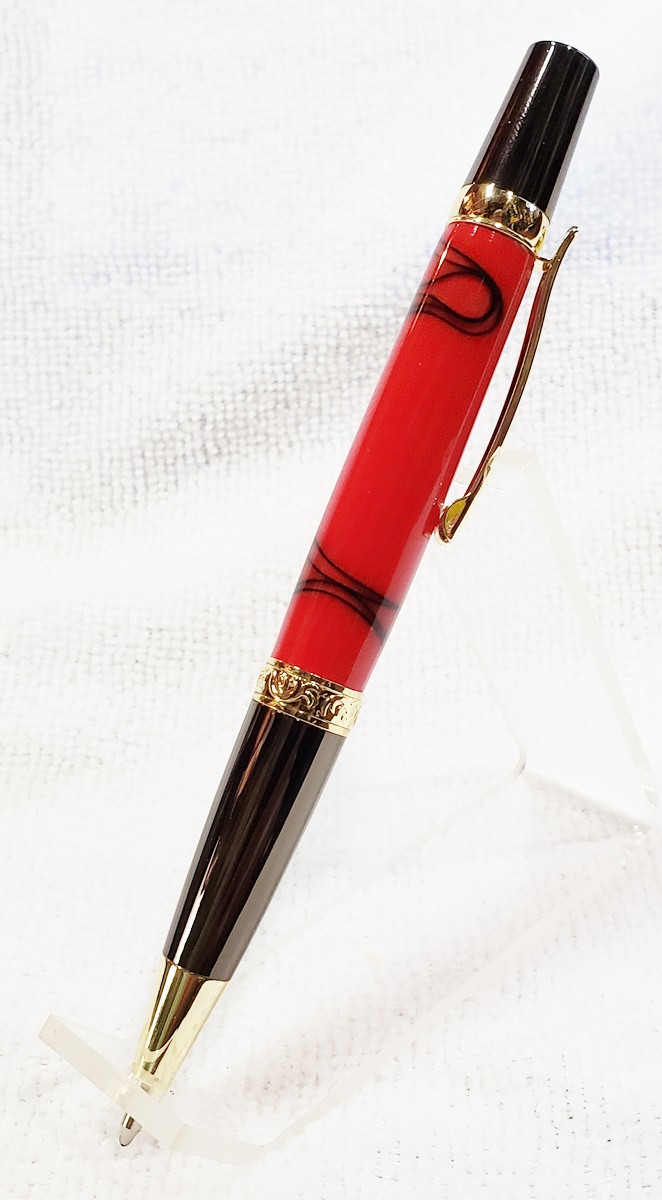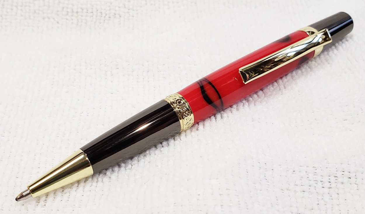 This is an Elegant Monarch in gold and gunmetal from Turners Warehouse. The blank is an AA called Cherry with Rose Swirl, from PSI. I'm immensely disappointed with the blank. Almost all the "figure" got turned away. I was hoping there was something hidden inside, but alas, nothing. Not a bad looking pen, but should have been better, in my opinion.