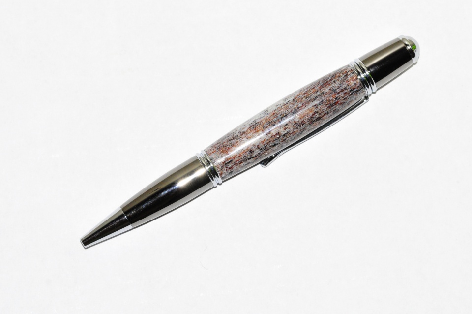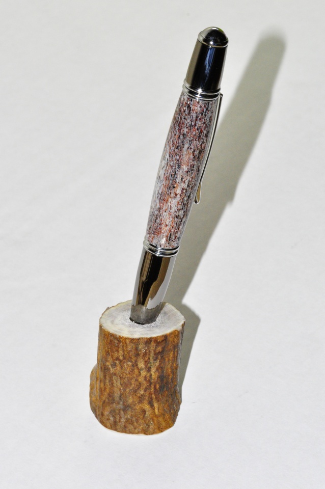 Elk antler on a Monet. This was a pain to seal, very porous. It took about 10 coats of ca, cleaned up with a skew re-sanded to 1000 grit another 10 coats of ca medium, micro mesh to 12000. The first picture has the finished pen inserted into what is left after turning two pens (only one pen is shown, The antler was purchased at the pet store, originally sold as a dog chew. My Boxer was quite upset, he thought it was for him.