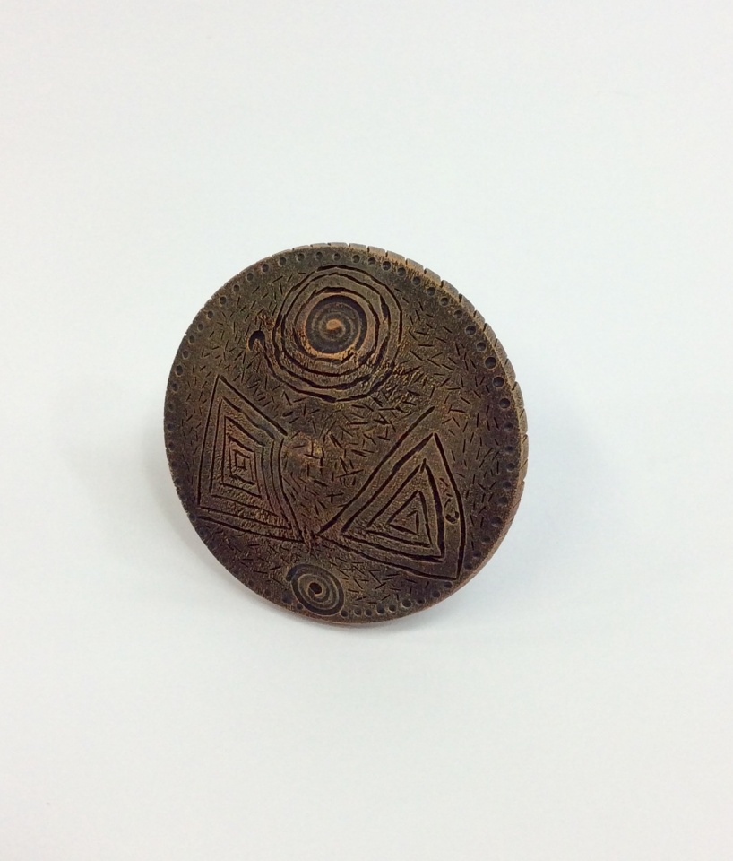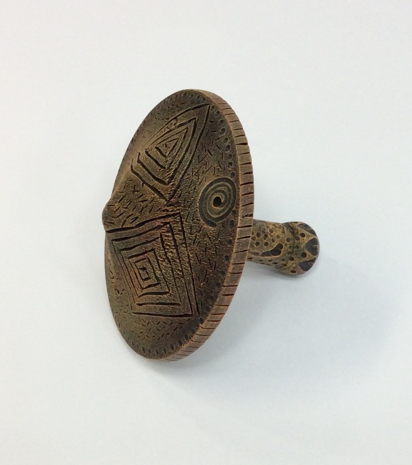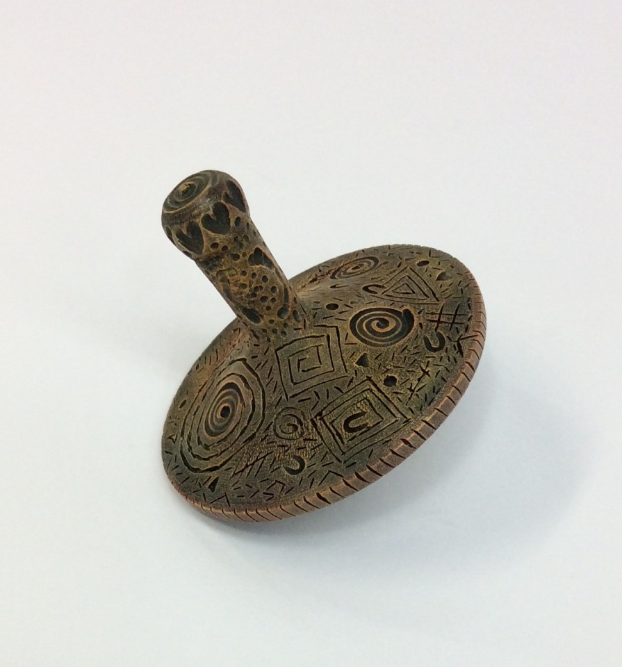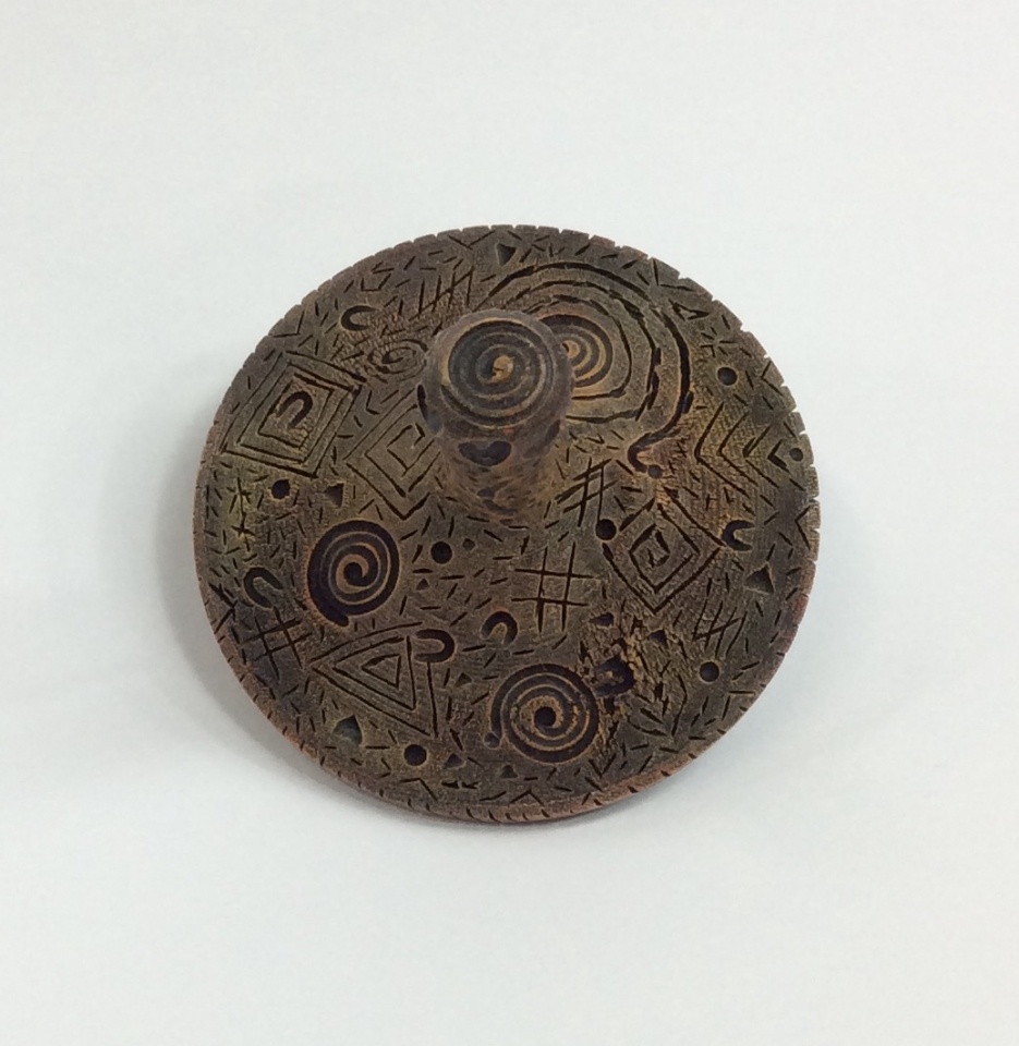 In the same Jacques Vesery workshop this summer, I did some pyrography and coloring on a small spin top. The maple top was turned by a friend who had a box of them and handed them out for folks to use as palates for embellishing.