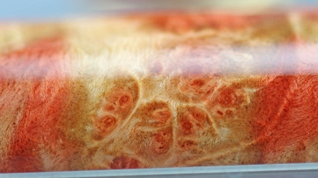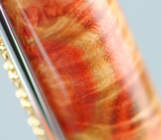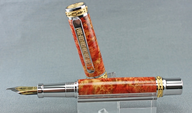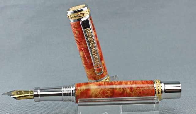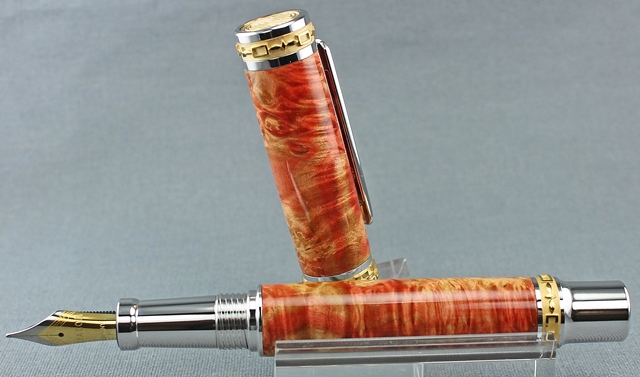 Spectacular piece of flame red Box Elder burlw tih some quilting. Pen style is full size Emperor.