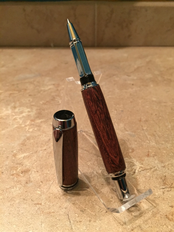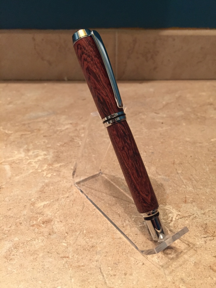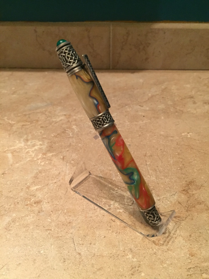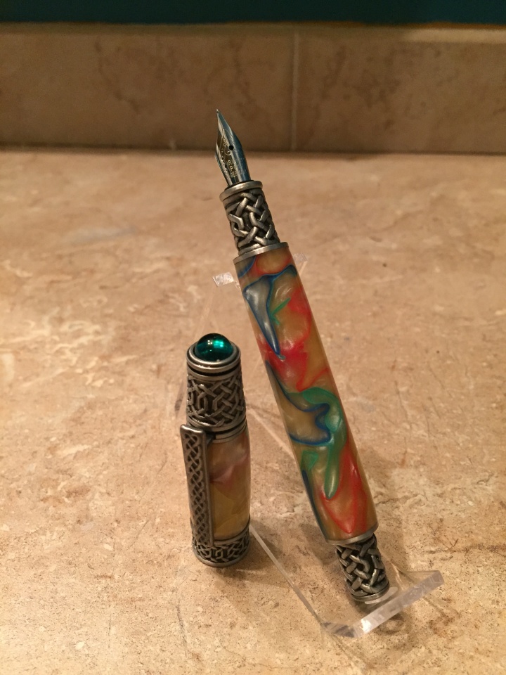 Finally got some time, now that the semester is done, to turn a couple of new pens. The first is a commissioned piece that I hand't tried before - an antique pewter Celtic Fountain pen. The second is a chrome Navigator roller ball pen out of a mystery wood from my random stack =)