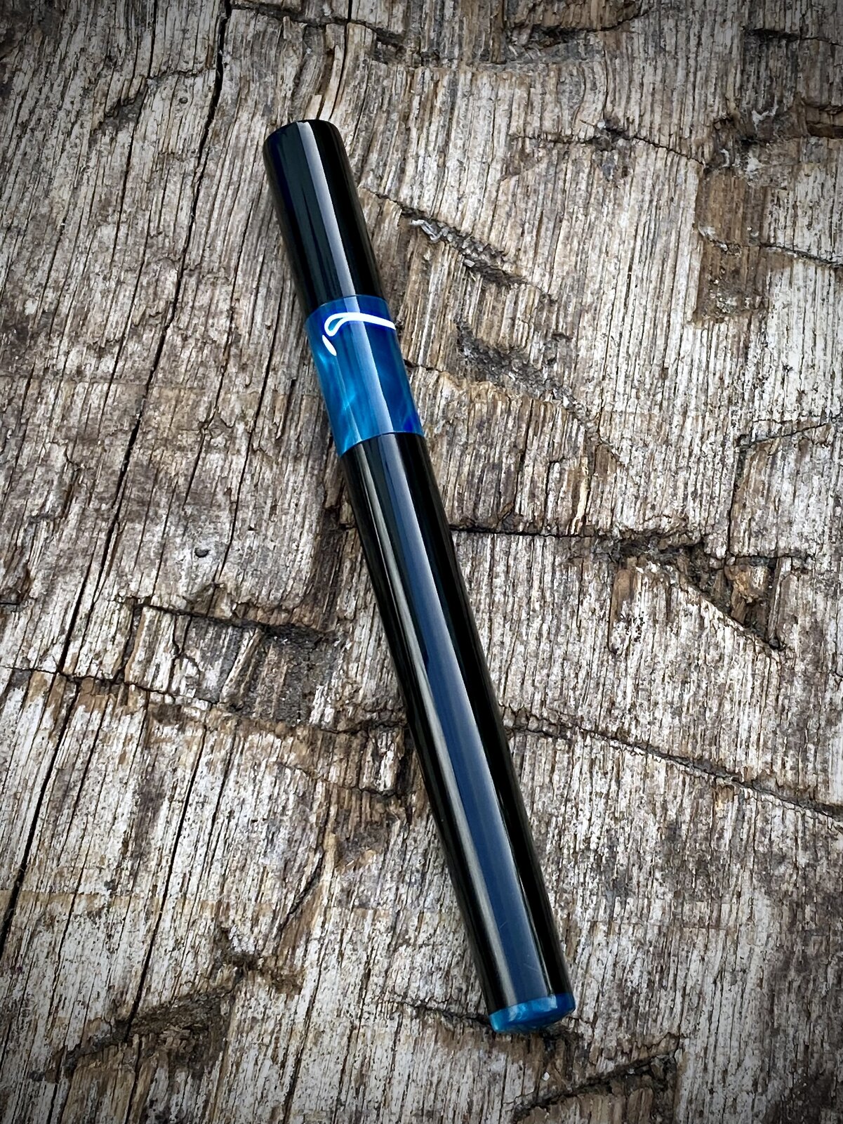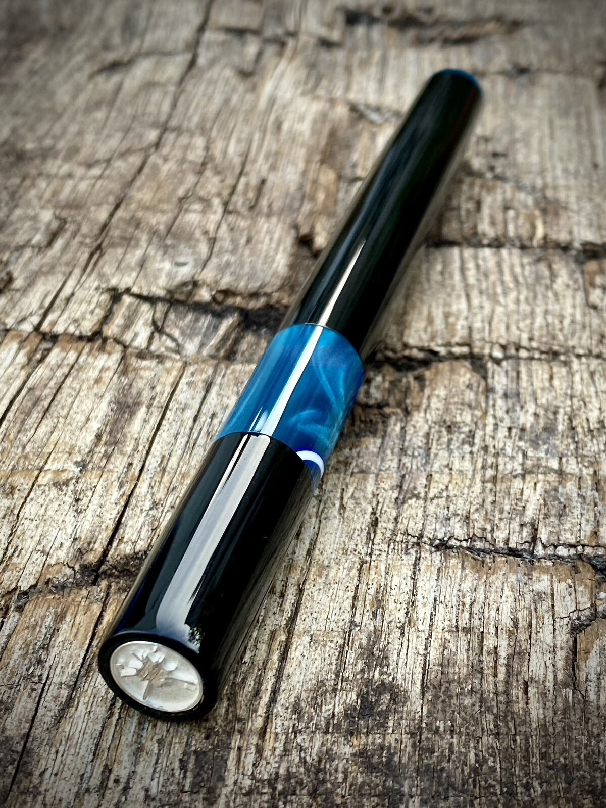 In this example the material is vintage black cellulose acetate which starts out looking like a battered old bicycle inner tube but polishes up beautifully. The blue section is made using original Aqua so Bologna acrylic from the now defunct Omas factory. I also use this on the end of the barrel to seal the pen. My sterling silver finial coin performs the same function at the end of the cap.
