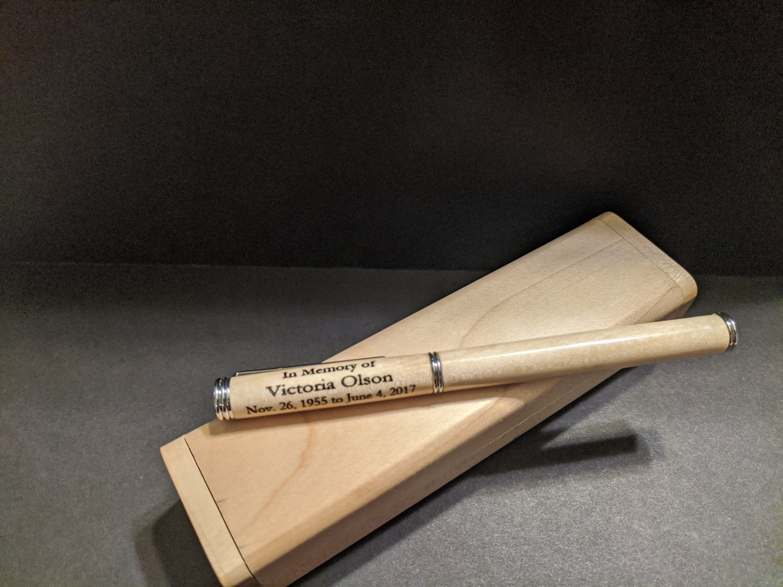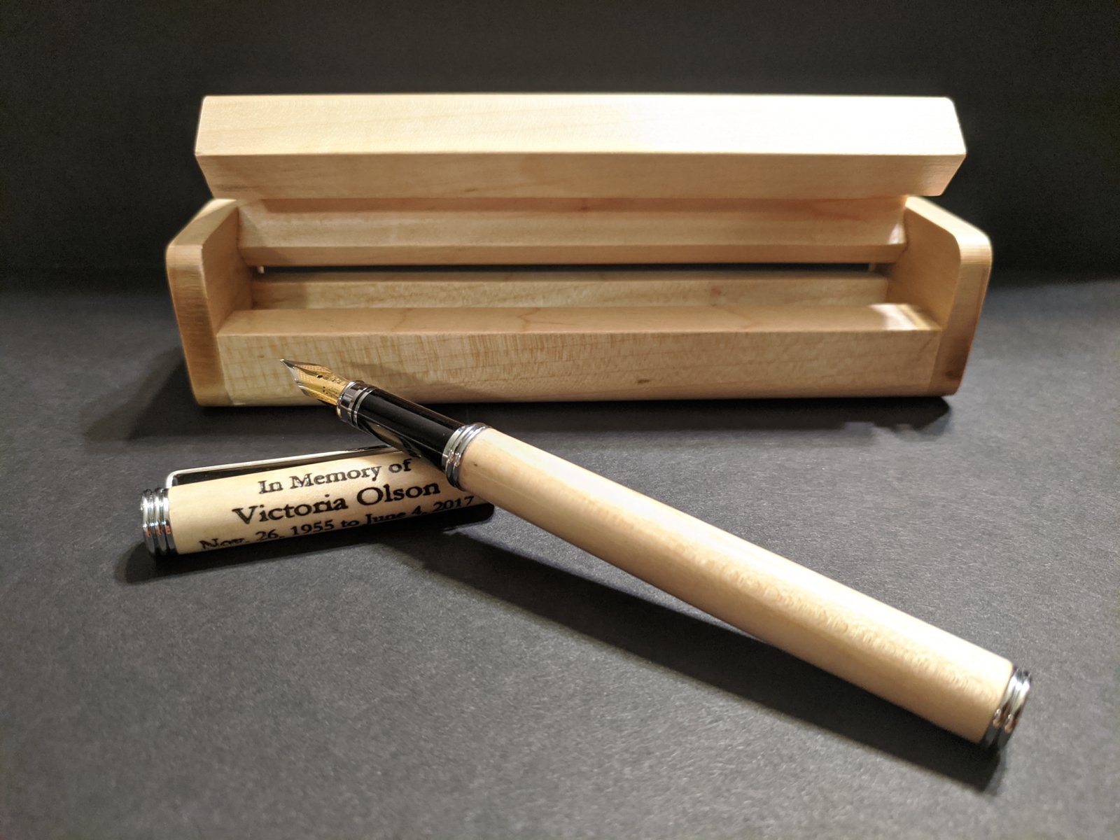 I just delivered this Conservative fountain pen to a co-worker. The maple came from an old maple that was taken down in his front yard due to a highway expansion. He told me that him and his wife were sad to see the tree to go because it was only about 4" in diameter when they bought their house. About a month or so after the tree was taken down his wife suffered a heart attack and passed. He told me he knew without a doubt what he wanted to do with a piece of the tree.