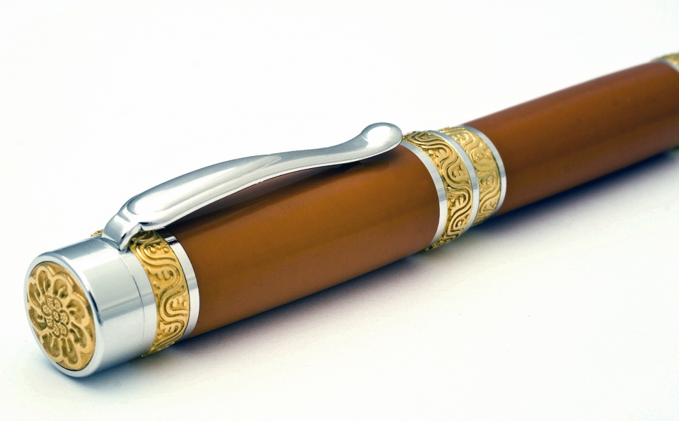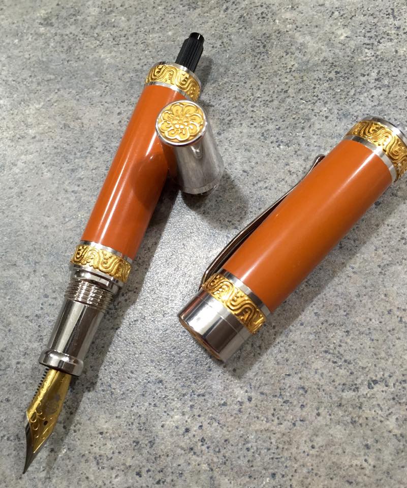 Once I was able to ascertain the meaning of the lotus things quickly became clear what I should do. The 22kt gold plating symbolizes reaching enlightenment or even botanical fully flowering. Watching the lotus flower bloom above the mud and be pristine is a very amazing sight to see. This is why I chose vintage red/orange ebonite as the base, to symbolize the mud, the suffering, the agony and other feats to overcome and in doing so makes us stronger. Orange is also a good contrast against the 22kt gold plating. Orange is also the new black.