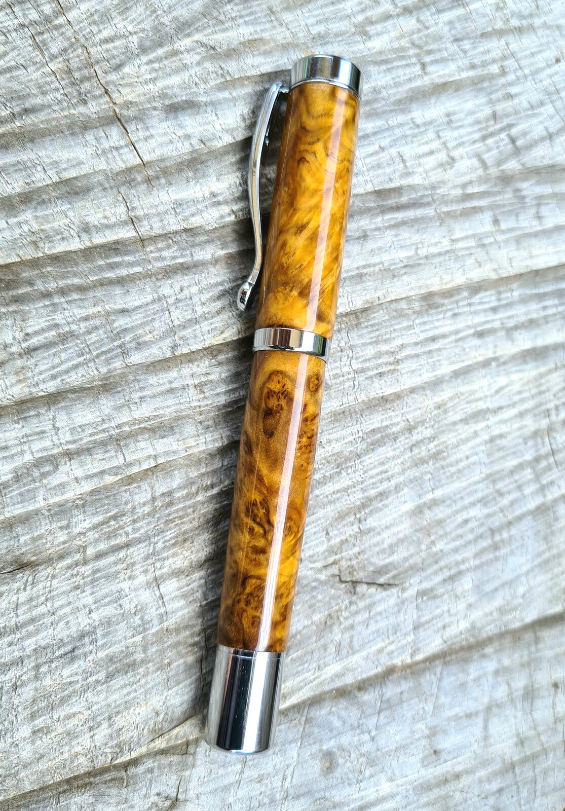 I purchased a parcel of goodies from Djarilmari timbers in Western Australia. Neale has some unbelievable burls, alot of not so common ones including this, Eucalyptus Gracilis burl or 'snap and rattle' burl as it is more commonly known. It has a lovely mustard yellow/brown finish, and the eyes in parts remind me of seeded mustard. A pleasant burl to turn. My usual CA finish, as I love glossy pens!