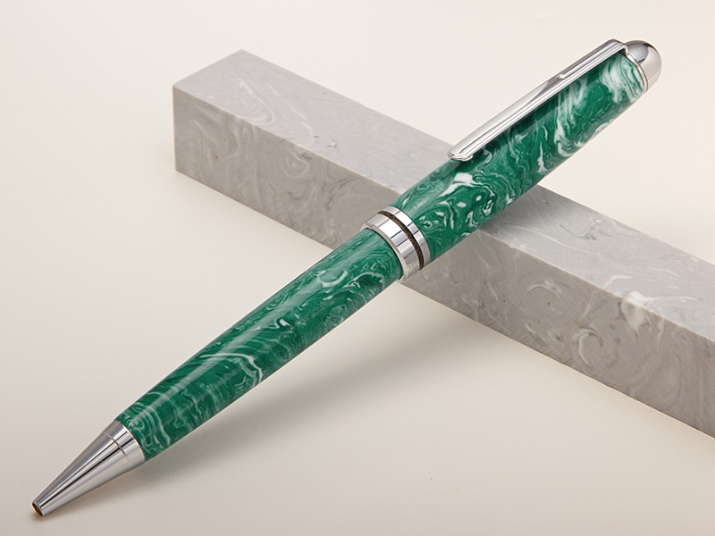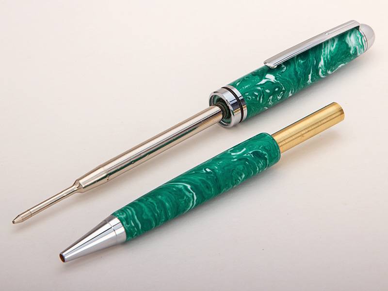 I didn't want to change the outside appearance of the pen, however, so I cut the blank such that the tube would extend from the lower barrel, and the tube would be recessed in the upper barrel. Part of the reason I chose a euro-style over a slimline, was to allow a thicker (and therefore stronger) unsupported section of the blank. The blank is made from alumilite white resin, which is strong and durable even without a brass tube. I selected a green marble pattern. This is the pen completed but with the halves separated.