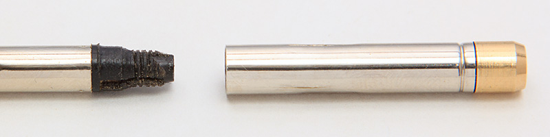 I wanted to make a modified pen that didn't look like a modified pen, so I set out to adapt a euro pen kit to take a parker-style refill. First off, I drilled out the nosecone with a #38 bit. Then I pulled the plug from the end of the refill, turned it down, and threaded it with a M5 x 0.8mm die. That way, it will screw into a standard 7mm transmission: