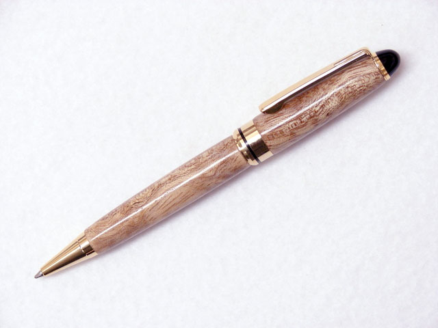 8mm twist ballpoint with Gold plating and Curly Bubinga. Finished with Minwax Satin Polyurethane.