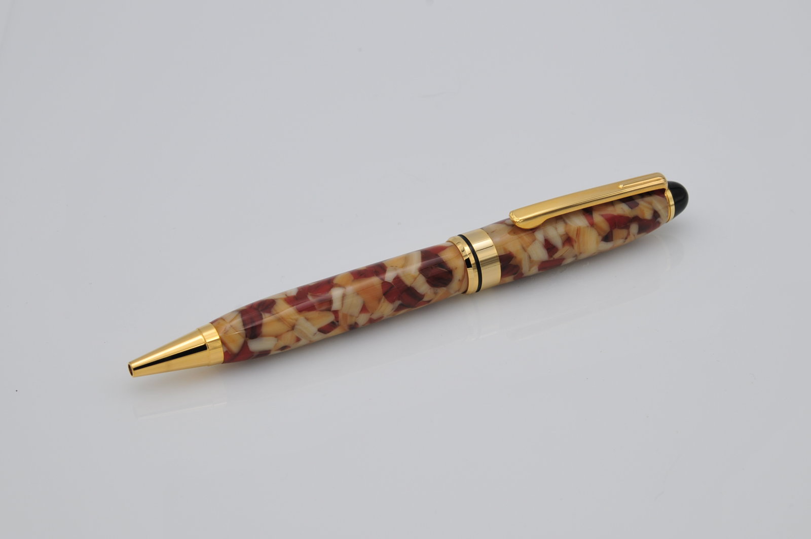 Four more European Round Top twist ball point pens. First two are Teal Pearl and Red Pearl with Platinum. Third is a Conway Stewart Shingle blank with Titanium Gold. And last is some vintage material I've had a long time, but don't remember much about it with Titanium Gold.