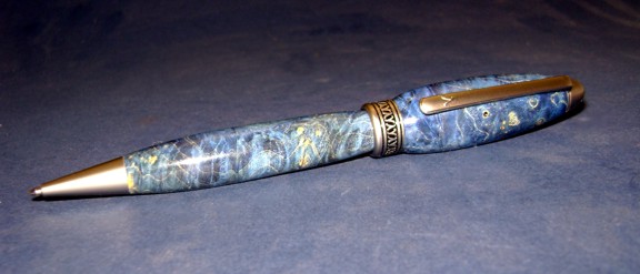 Here is 2 of 10 Euro's I've done. One is Dyed Blue Boxe Elder with a CSUSA Nickle plating. And the other is "some kind of wood" that is curly. I know its not Maple, I got it is a blank swap. I wanted to make the curl pop better than what is was appearing so I used black analine dye, sanded down and then some light walnut dye, sanded down and repeated several times. Both are finished with plexi.
