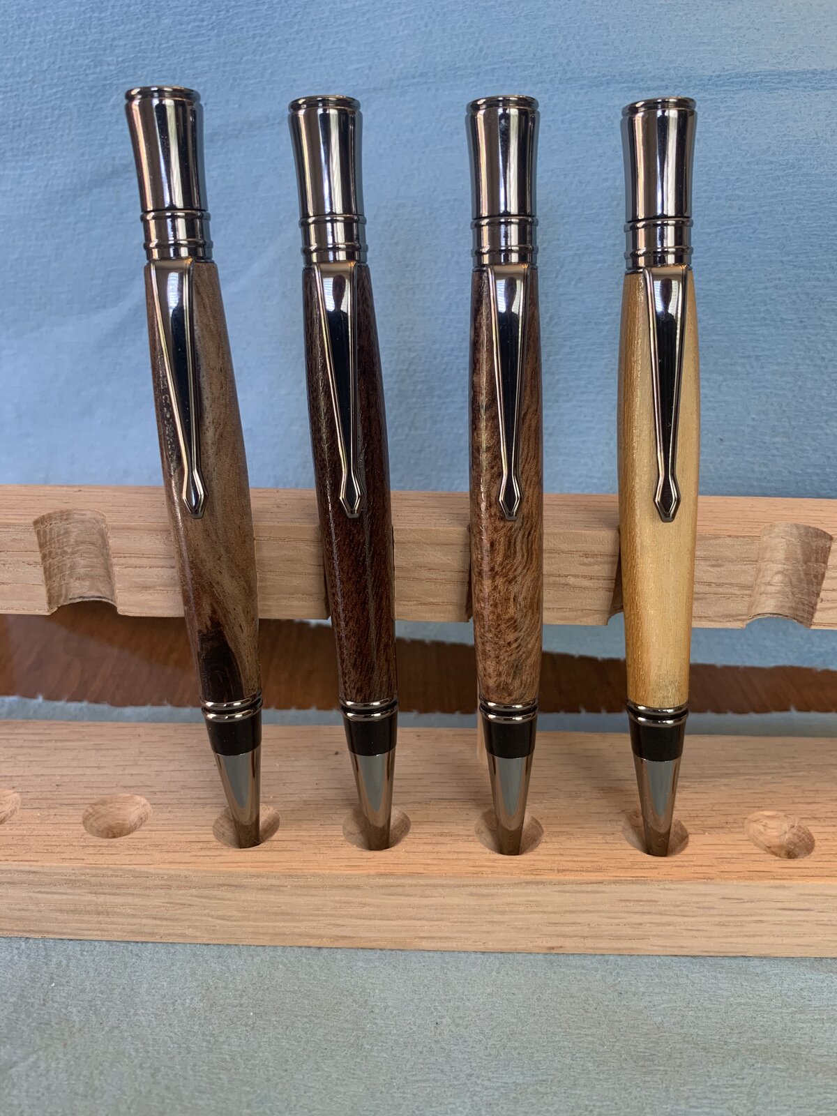 Been working on these four pens. The style is the Executive (gun metal finish) and the woods used (left to right) Pecan, Walnut, Spalted Elm, and Orange Osage. Have a blessed week.