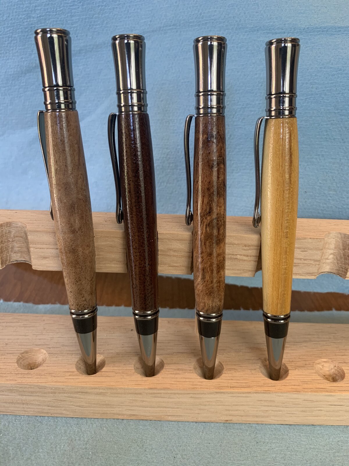 thomgarner Member Joined Jun 13, 2019 Messages 136 Location Boerne, TX Sep 14, 2020 #1 Been working on these four pens. The style is the Executive (gun metal finish) and the woods used (left to right) Pecan, Walnut, Spalted Elm, and Orange Osage. Have a blessed week.