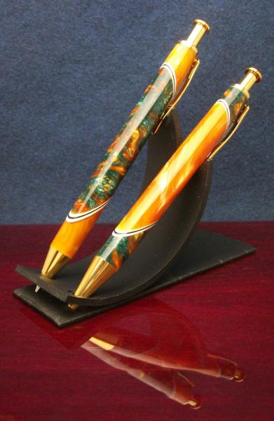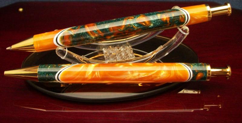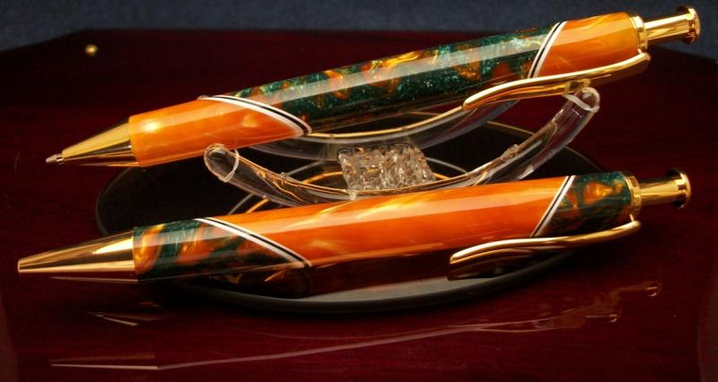 I segmented an "AMBER" blank from Exotic Blanks to an "AQUA GOLD" From Wood N Workshop with W/B/W pickguard. The top cut is at 45 degrees and the bottom is at 60 degrees both have been wet sanded to 4K then plastic polished. Both of these blanks have fantastic color and dept, they are on a set of Gold Long Click Pen and Pencil.