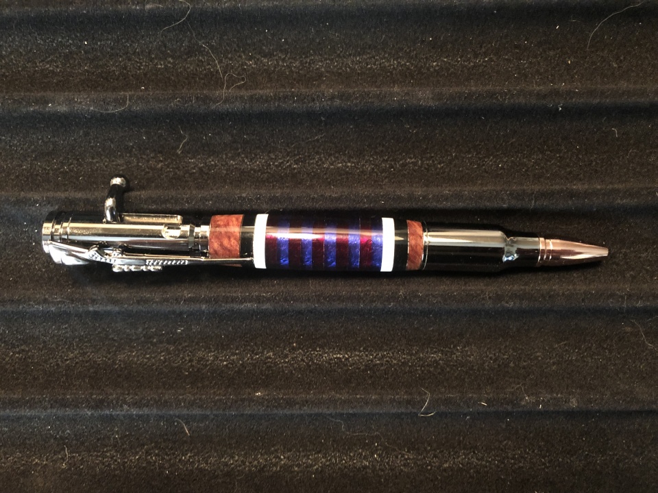 I purchased some 1/8" thick x 1/2" wide acrylic discs from ebay. Glued them together with some burl wood on the ends and made the body for this bolt action. I turned it and applied several layers of CA glue. I will try it again with some other colors and see if I can make it a little straighter. It was a good first try.