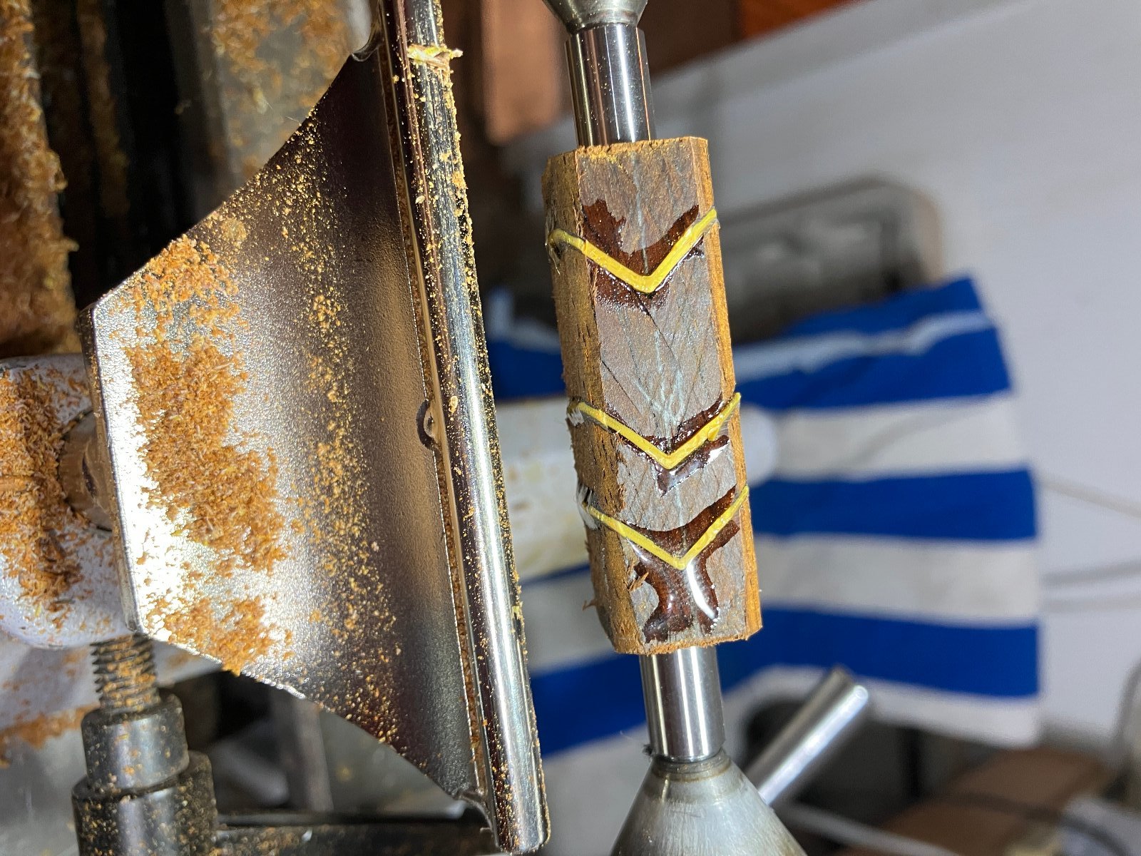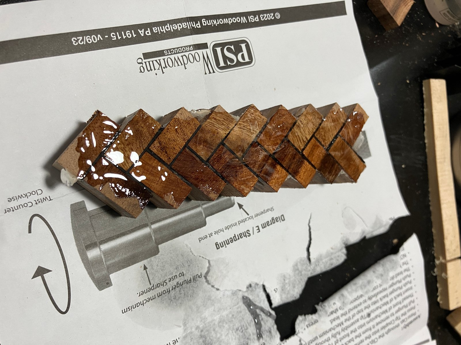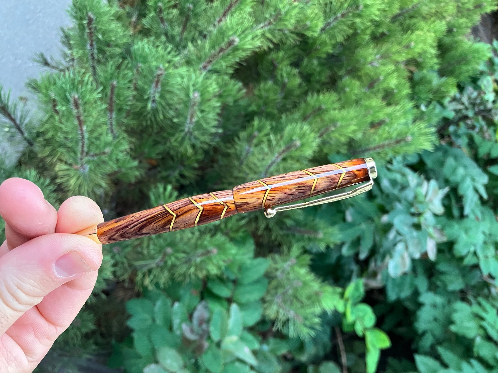 I've wondered for a while about integrating some of my more interesting-looking filaments into segmented pen blank designs, and decided to try it this week. This is a piece of king cocobolo with some 0.8mm thick scallops printed out of faux metallic gold silk PLA. I have the same filament available in copper, silver, mother-of-pearl, and gunmetal.