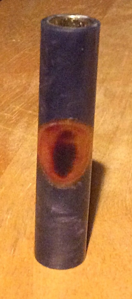 Some of the segmented pens in Summer Extravaganza reminded me of the shape of an eye so I started thinking of trying some sort of "eye" pen. Since I am a little bit of a Lord of the Rings geek, I thought about trying to do an Eye of Sauron blank. I mixed up some orange PR and some dark blue PR and used them to make a segmented eye shape. I then added a decal pupil. It did not turn out as well as I had hoped and I am not sure if I will assemble it into a pen. Thought I would share my experiment any way.