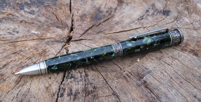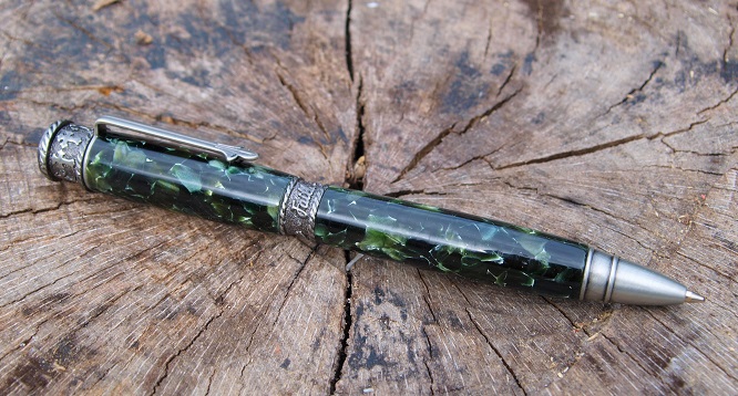 A pewter twist action pen with faith love and hope banding & fleur de Lys patterned clip .