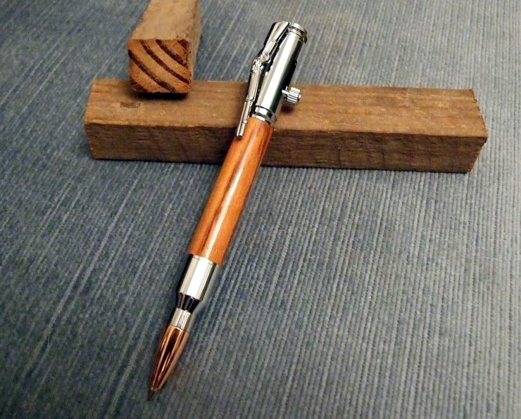 The first pen is a bolt action (CSUSA Lock N Load) made out of Georgia heart pine. The wood came from a friend's farm in south Georgia. It has been in his family's barns for decades sitting there getting dusty. You can see blanks I have already cut in the picture too, they were cut from stakes used as drying racks for tobacco. conveniently enough for me they are already in blank dimensions