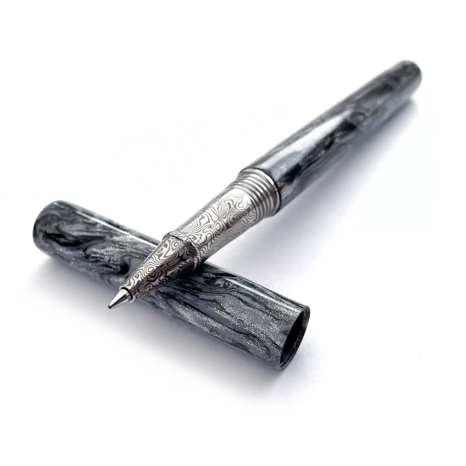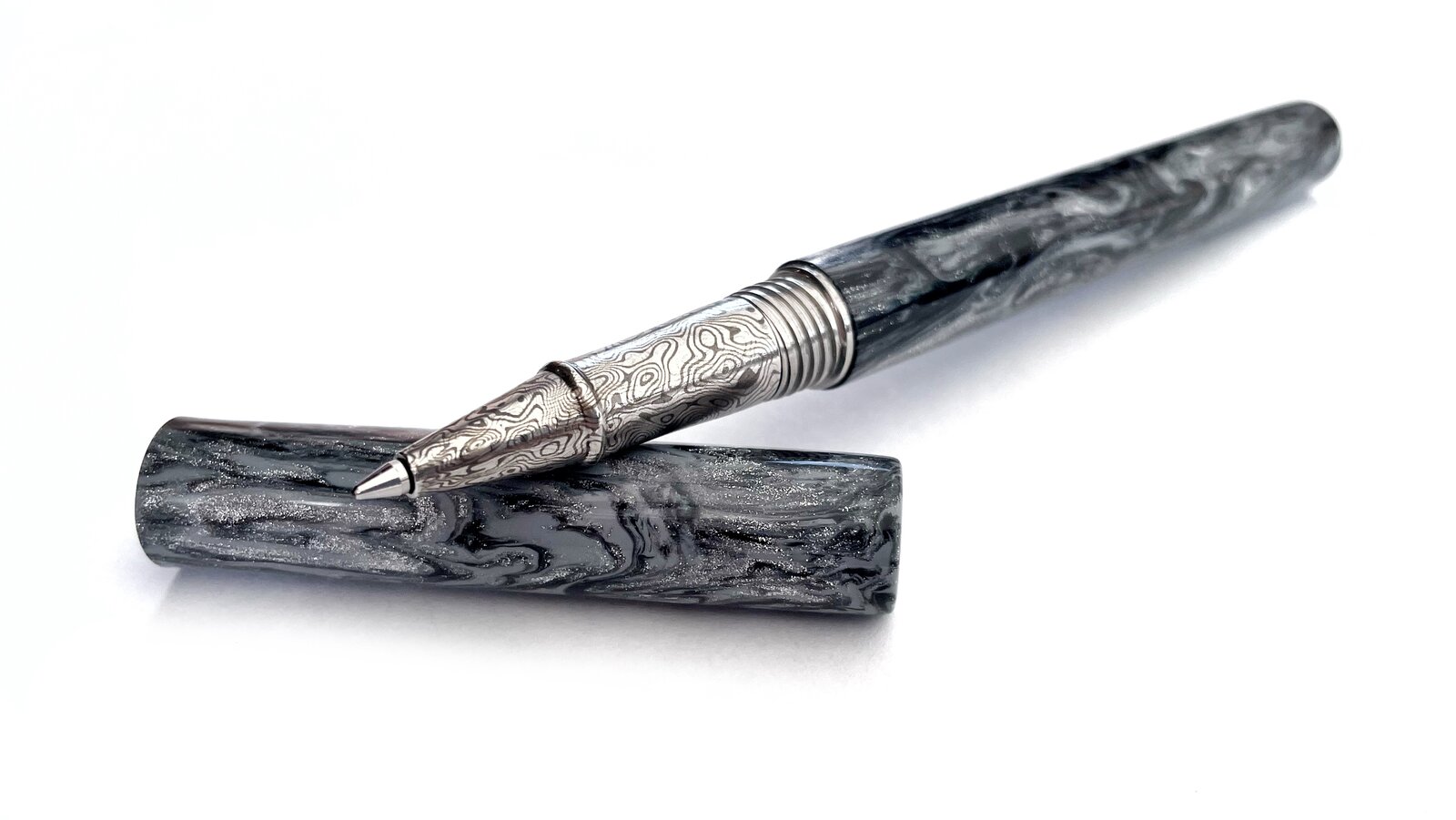 Faux Damascus pen blank from Divine Turning Supply on an Apollo stainless steel rollerball from Bullseye Turning Supply expertly custom engraved with a Damascus pattern by Braxton Frankenbery. I absolutely love how this pen came out, it's exactly how I envisioned it! Thank you Braxton for being a great collaboration partner on this!