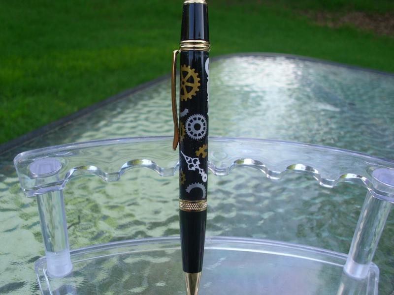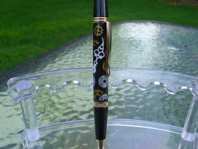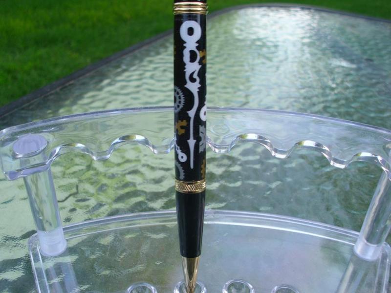 This pen was all made from vinyl, the details were cut with my Cameo vinly cutter. I use several layers of medium ca then sand and polish. I am haveing trouble with tiny specs in the ca. Maybe I shoud use a white background. The ca finish is thicker than I would normally use on a wood pen.