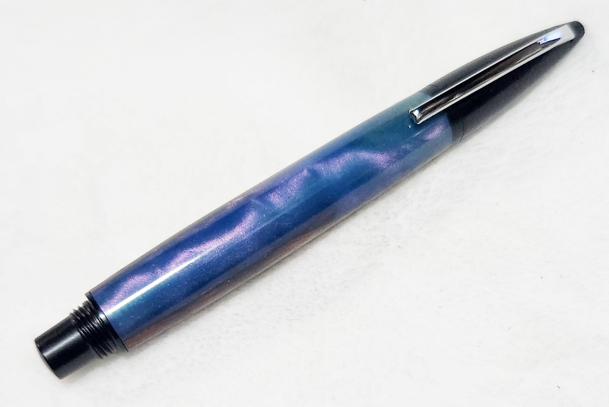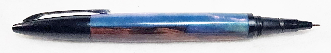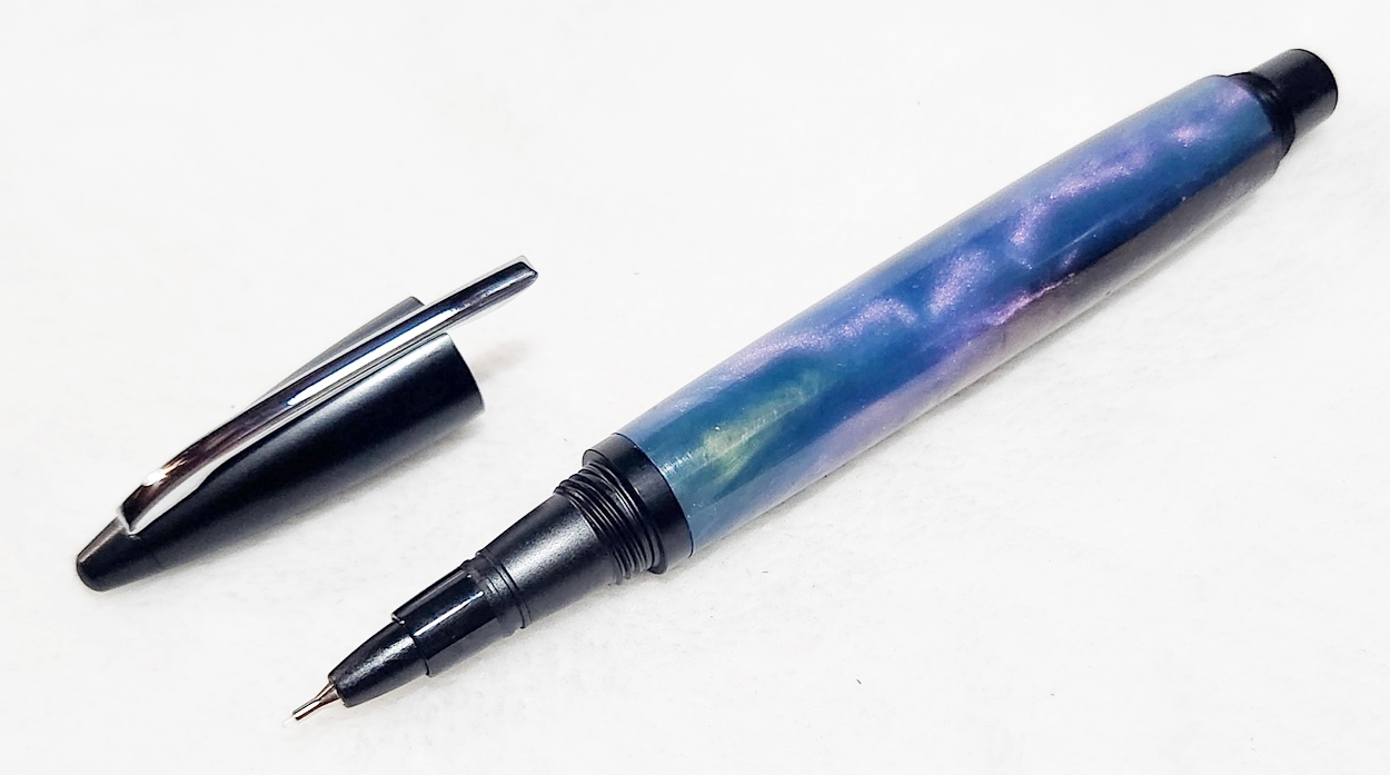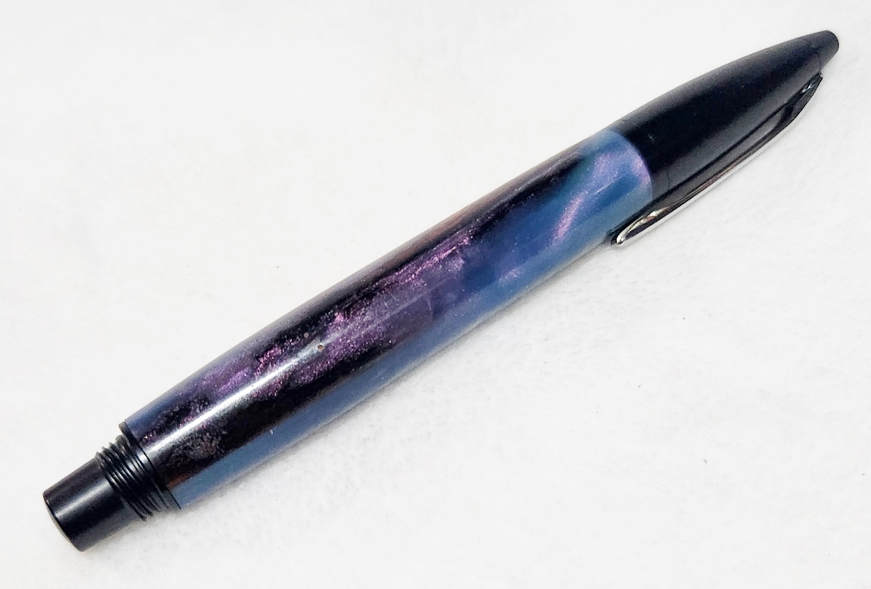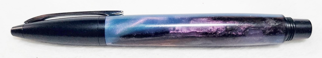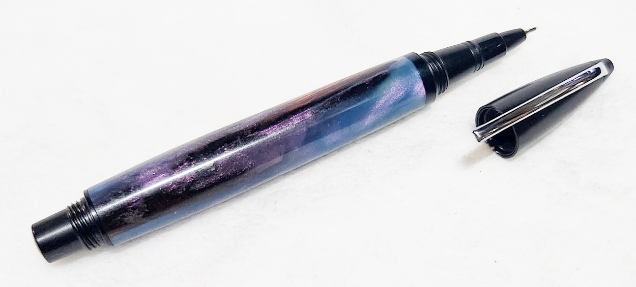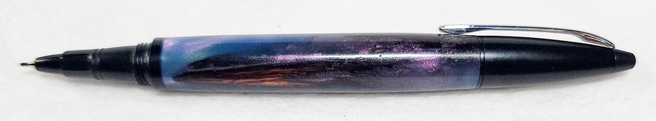 This is a PSI Fiber Tip pen in black. It's unusual in that it uses fountain pen ink, but has a fiber tip. The blank is a hybrid cast by my friend Dennis. I'm calling it Purple Prince. I dry sanded it to 3000, and finished it with Pens Plus.