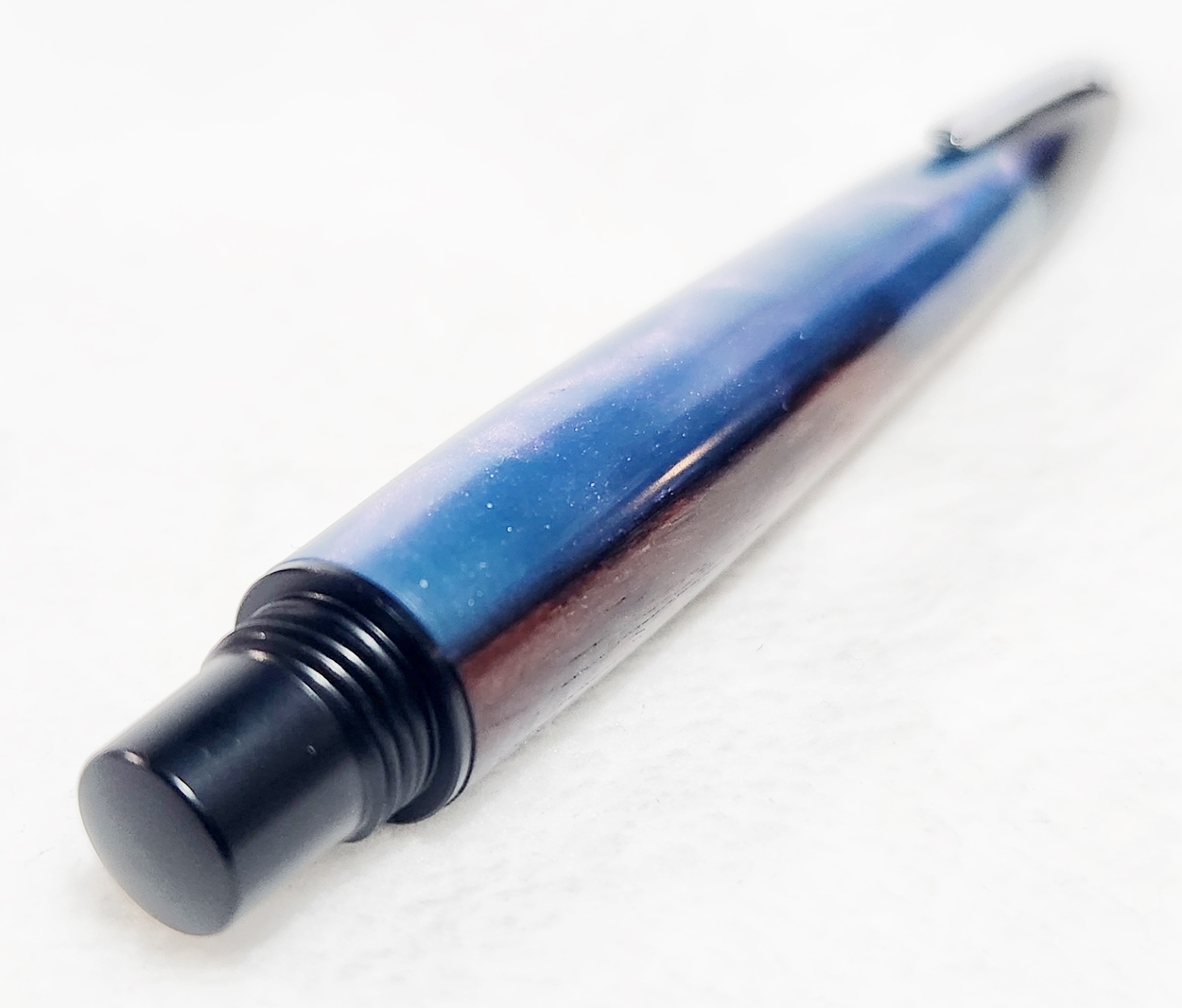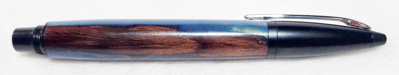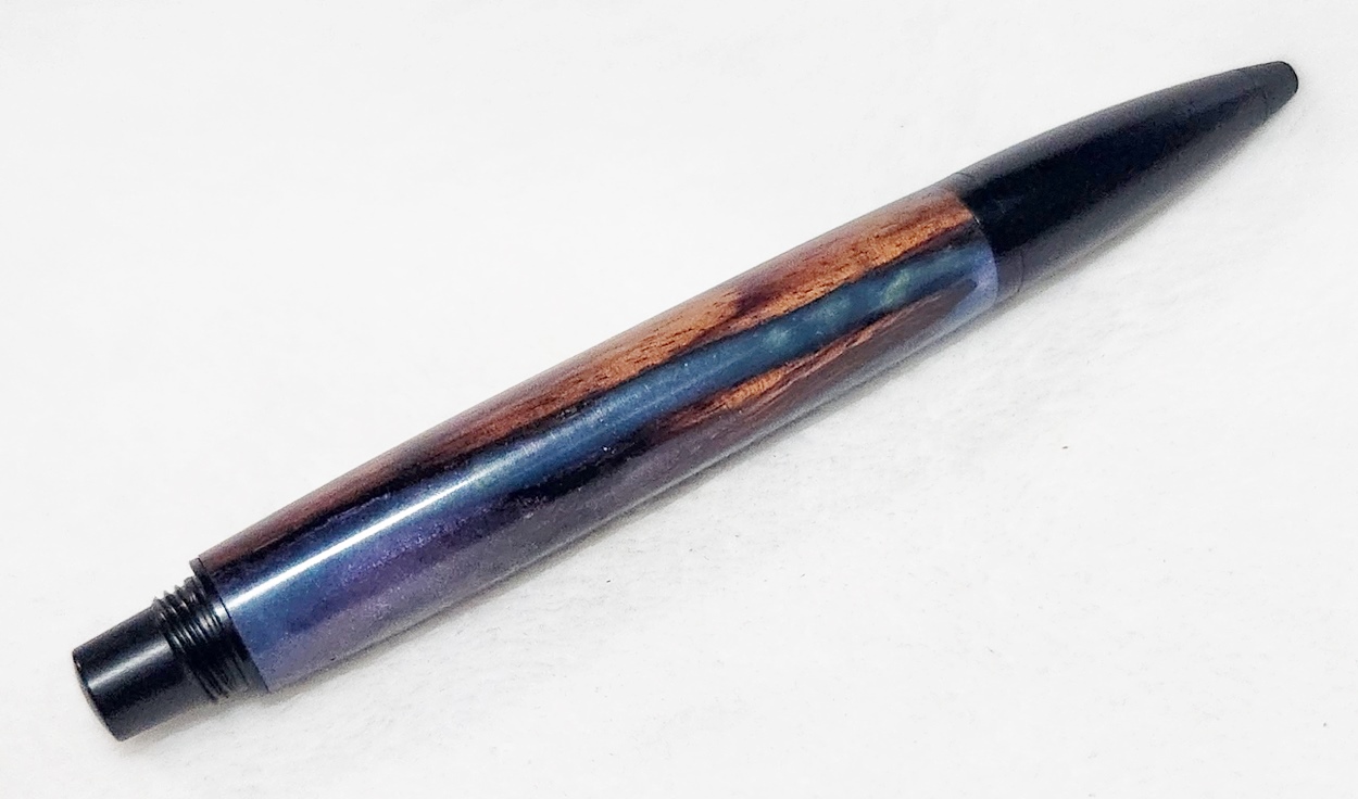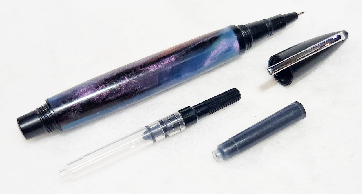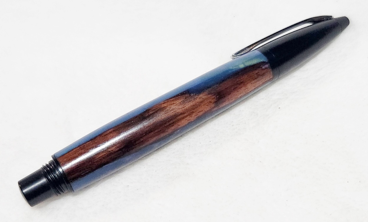 This is a PSI Fiber Tip pen in black. It's unusual in that it uses fountain pen ink, but has a fiber tip. The blank is a hybrid cast by my friend Dennis. I'm calling it Purple Prince. I dry sanded it to 3000, and finished it with Pens Plus.