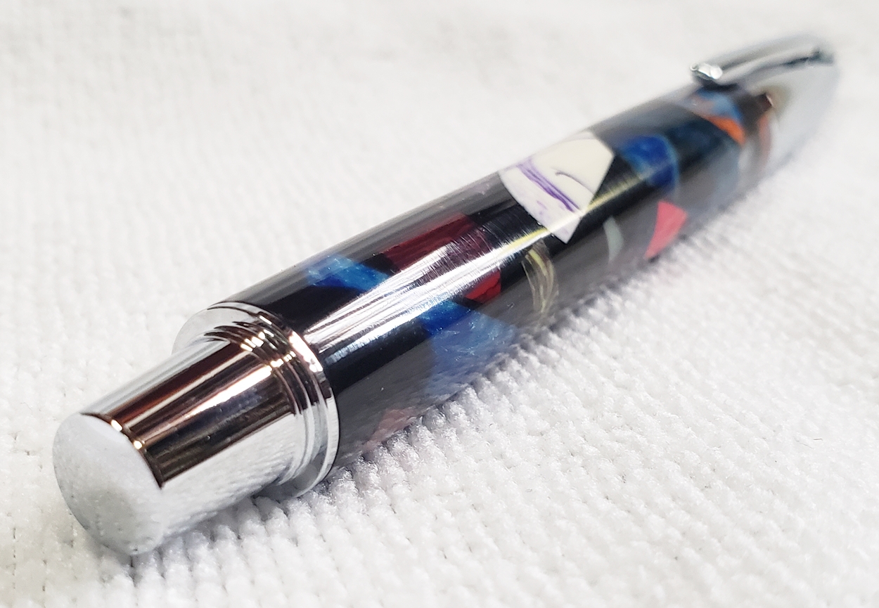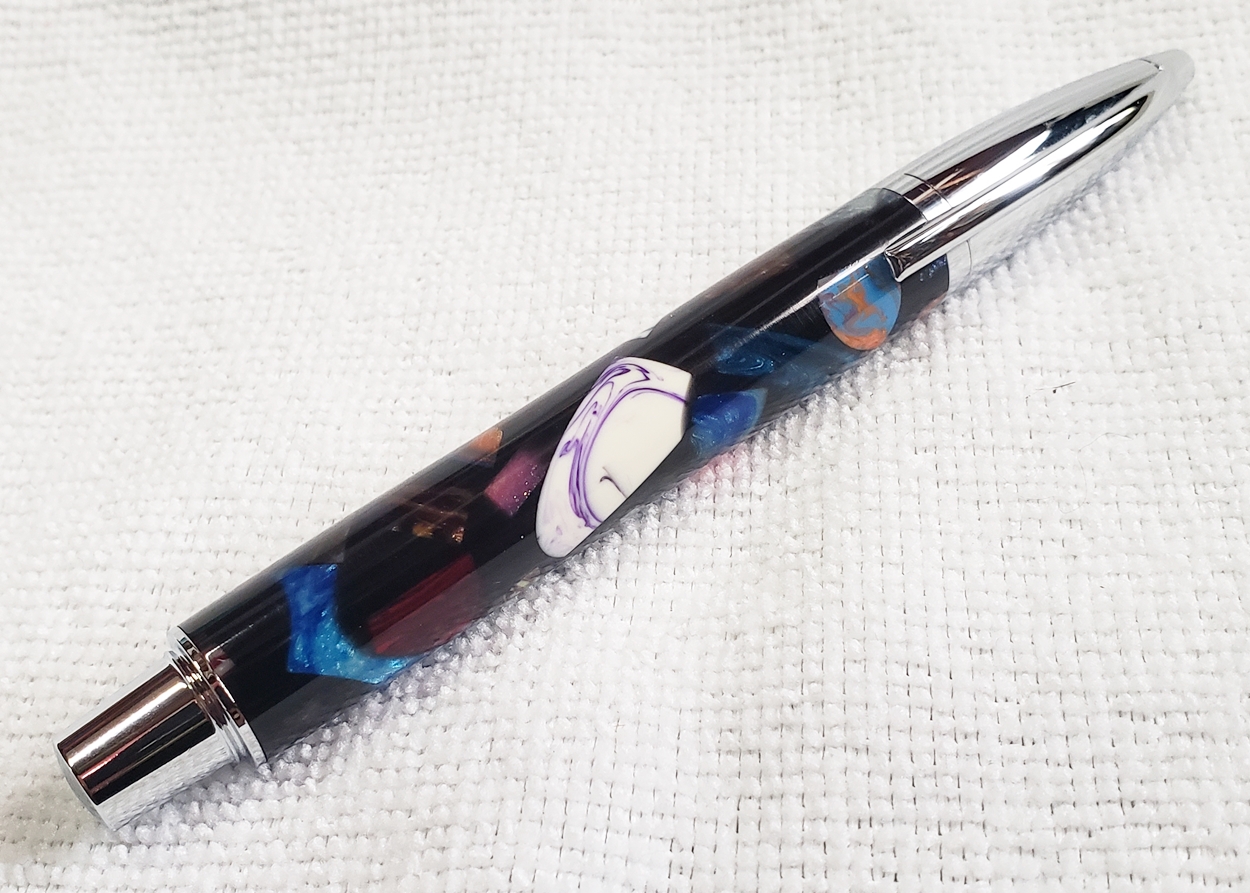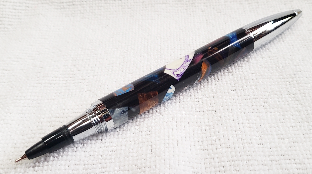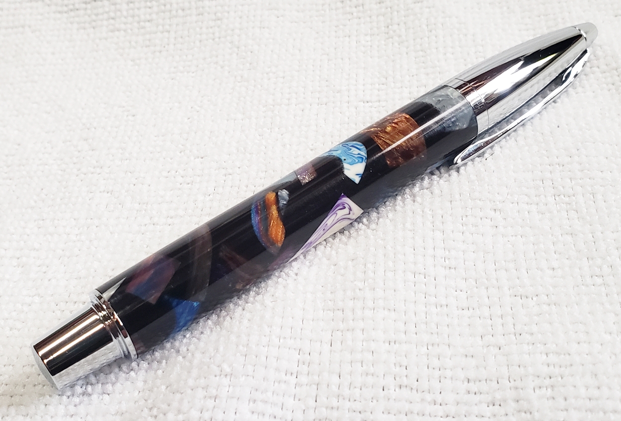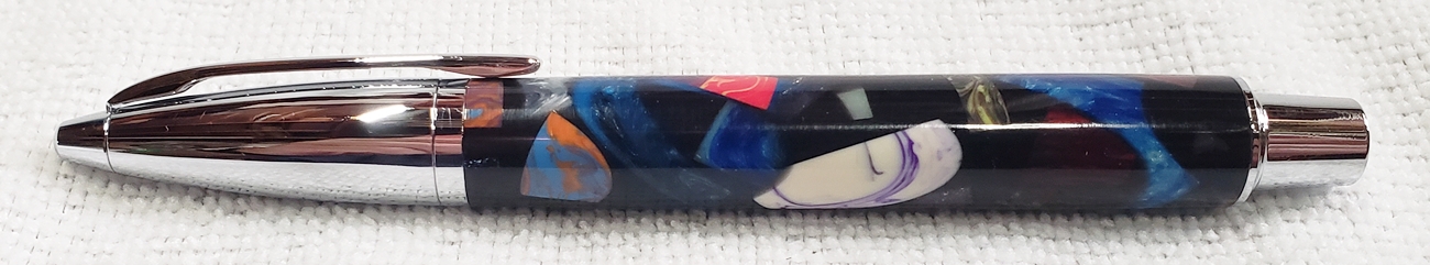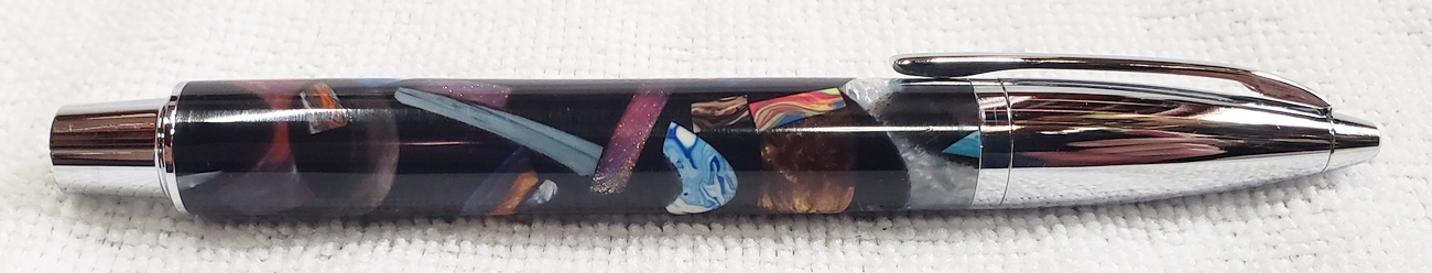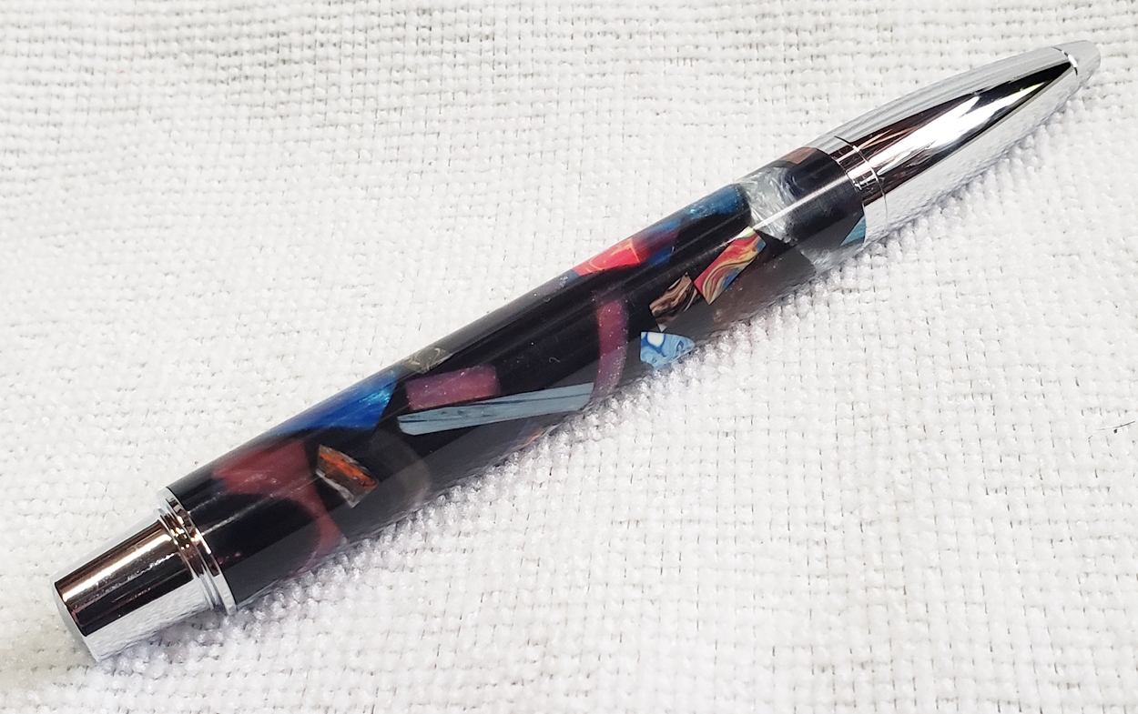 This is one of the new PSI Fiber Tip pens, in chrome. Interesting pen, in that it uses fountain pen ink, either cartridges or the included pump. I bought a spare tip for it, I don't know how fragile they are. The blank is an acrylic called Mosaic In Black II from Exotic Blanks. It's a big, beefy pen.