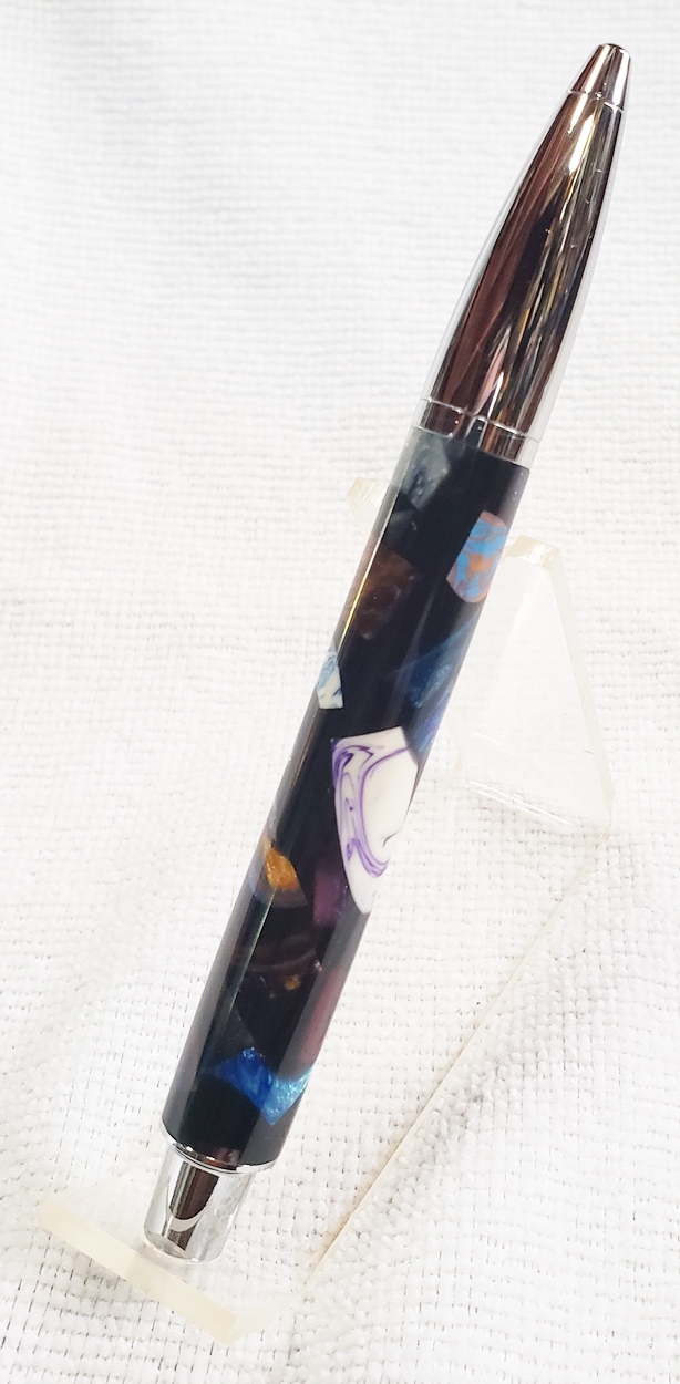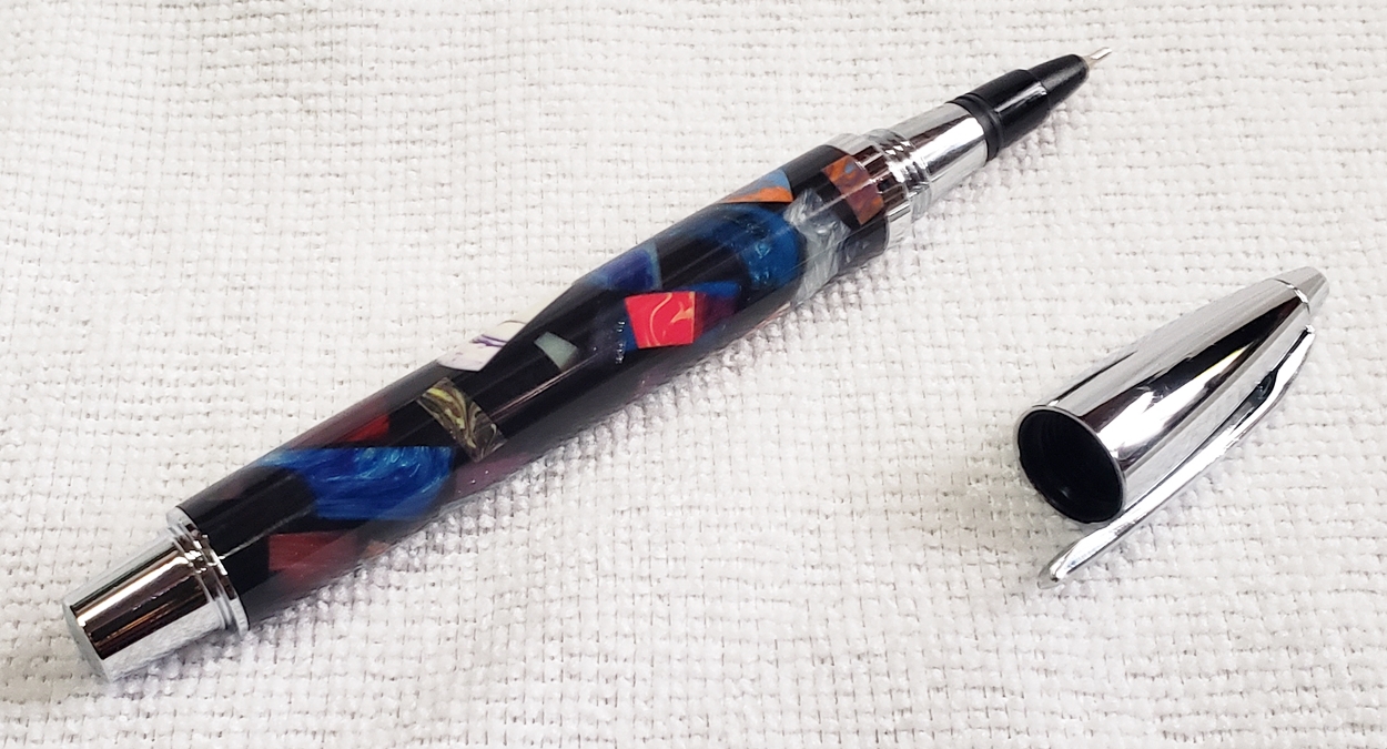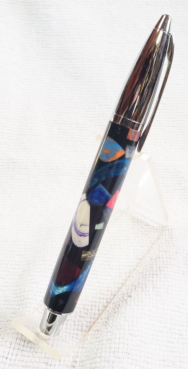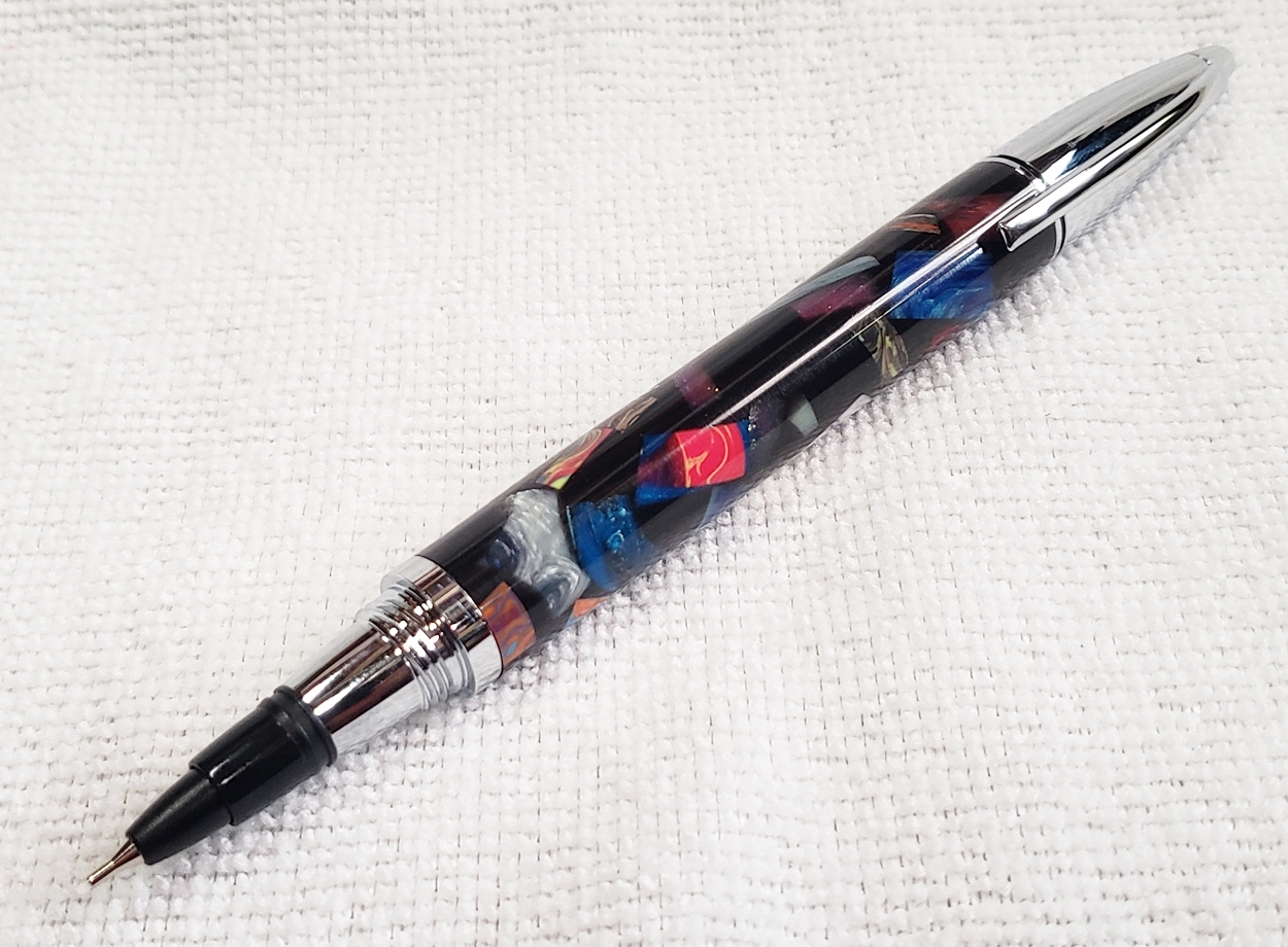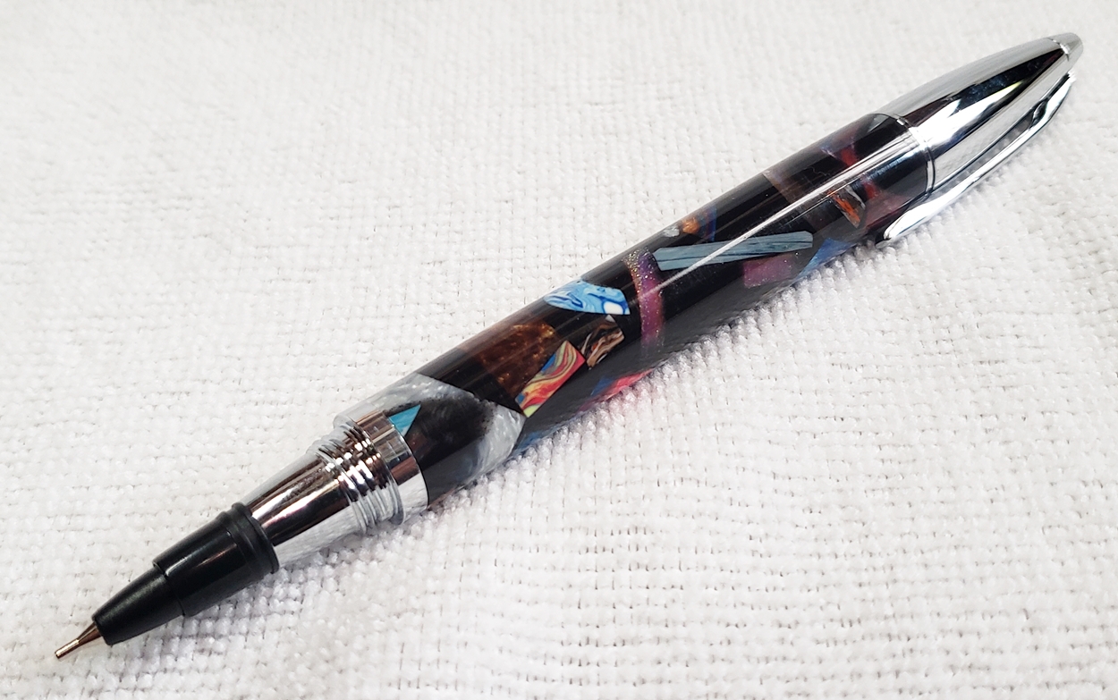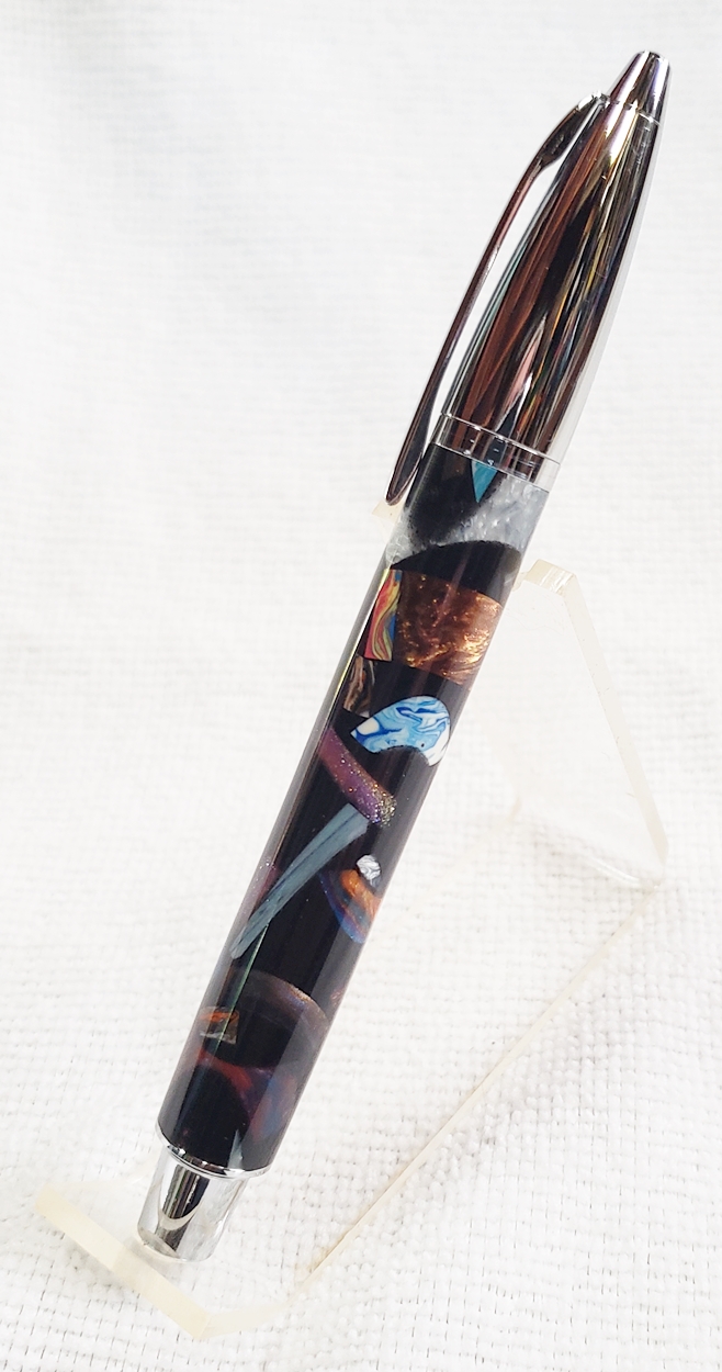 This is one of the new PSI Fiber Tip pens, in chrome. Interesting pen, in that it uses fountain pen ink, either cartridges or the included pump. I bought a spare tip for it, I don't know how fragile they are. The blank is an acrylic called Mosaic In Black II from Exotic Blanks. It's a big, beefy pen.
