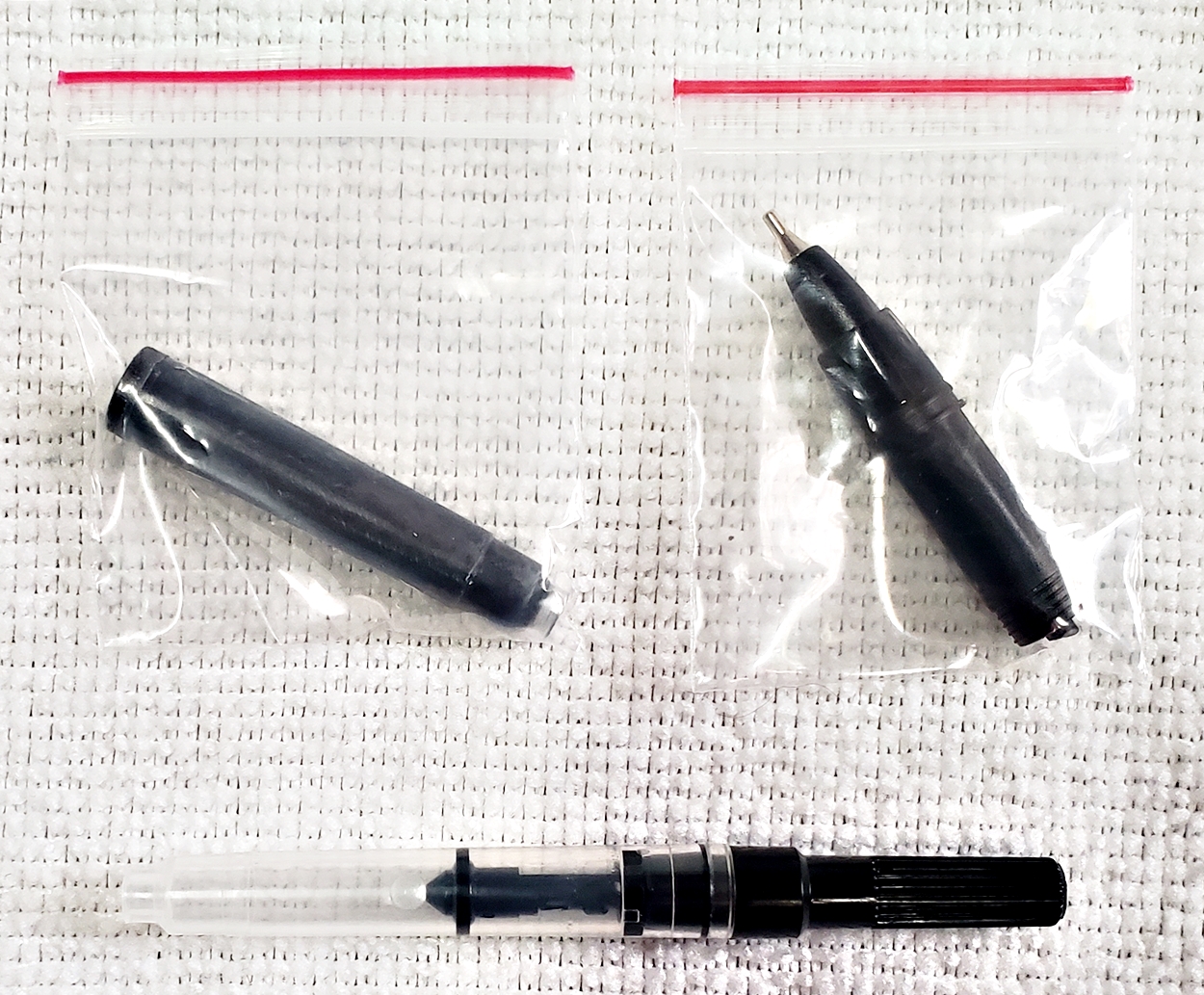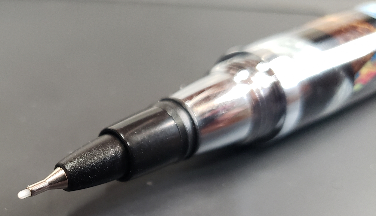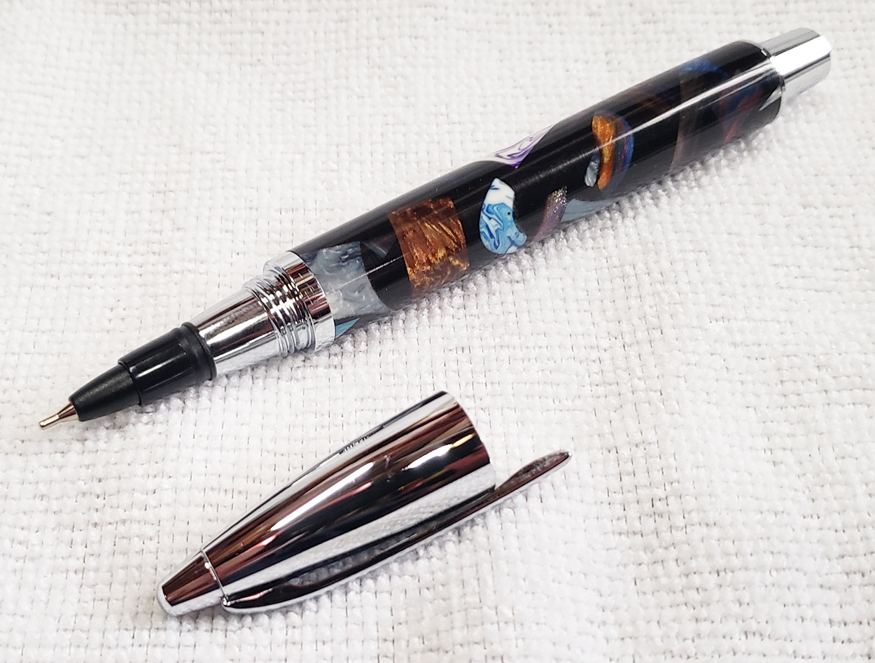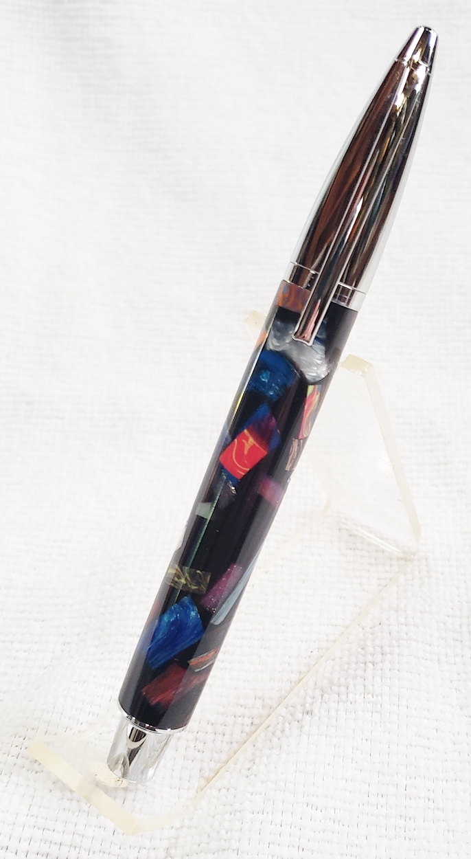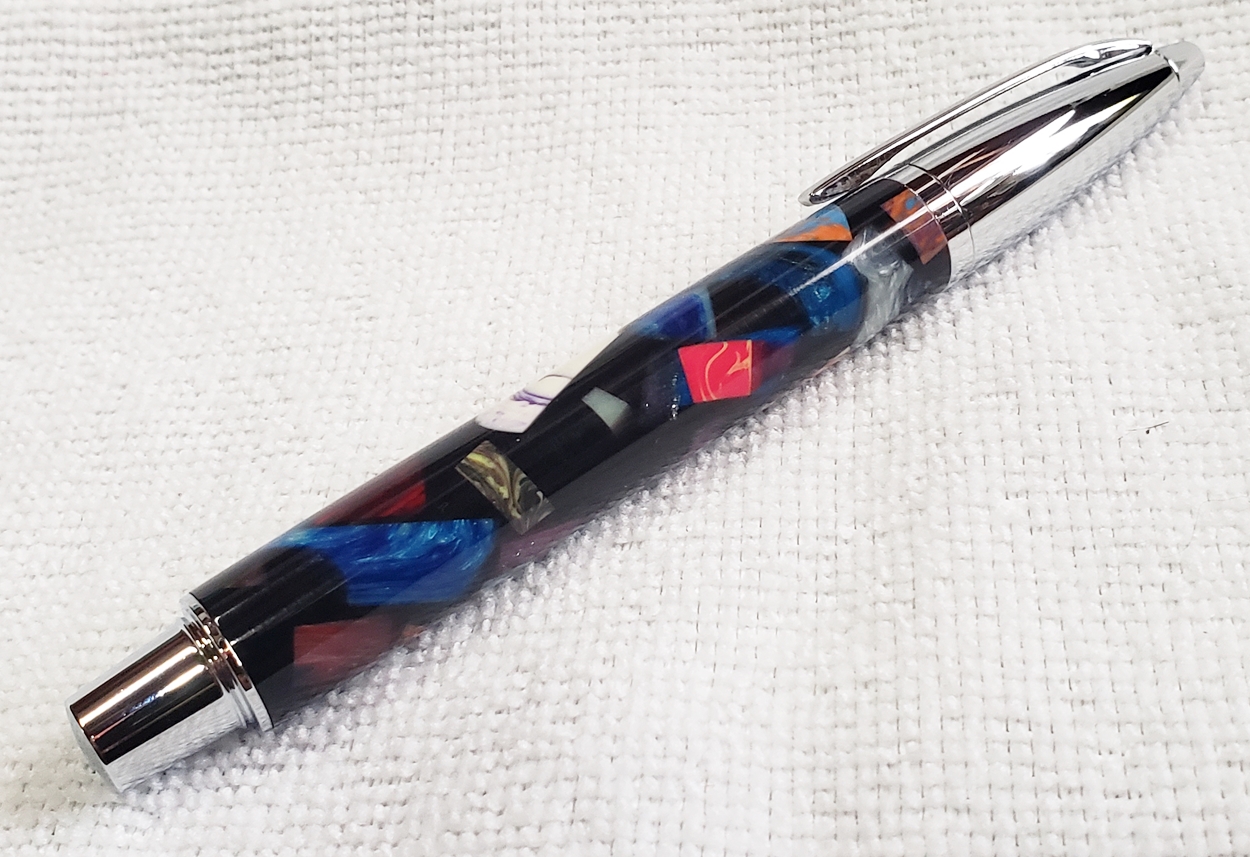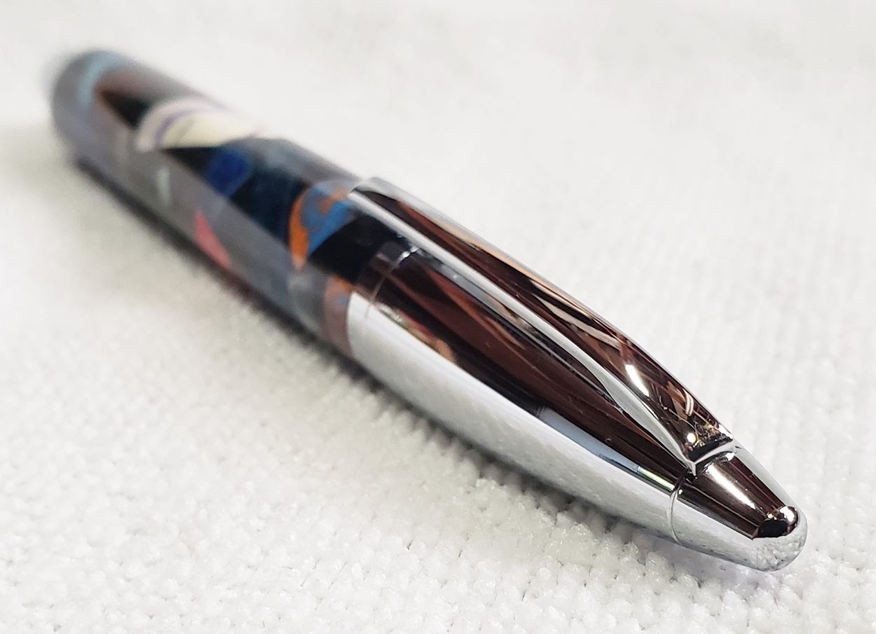 This is one of the new PSI Fiber Tip pens, in chrome. Interesting pen, in that it uses fountain pen ink, either cartridges or the included pump. I bought a spare tip for it, I don't know how fragile they are. The blank is an acrylic called Mosaic In Black II from Exotic Blanks. It's a big, beefy pen.