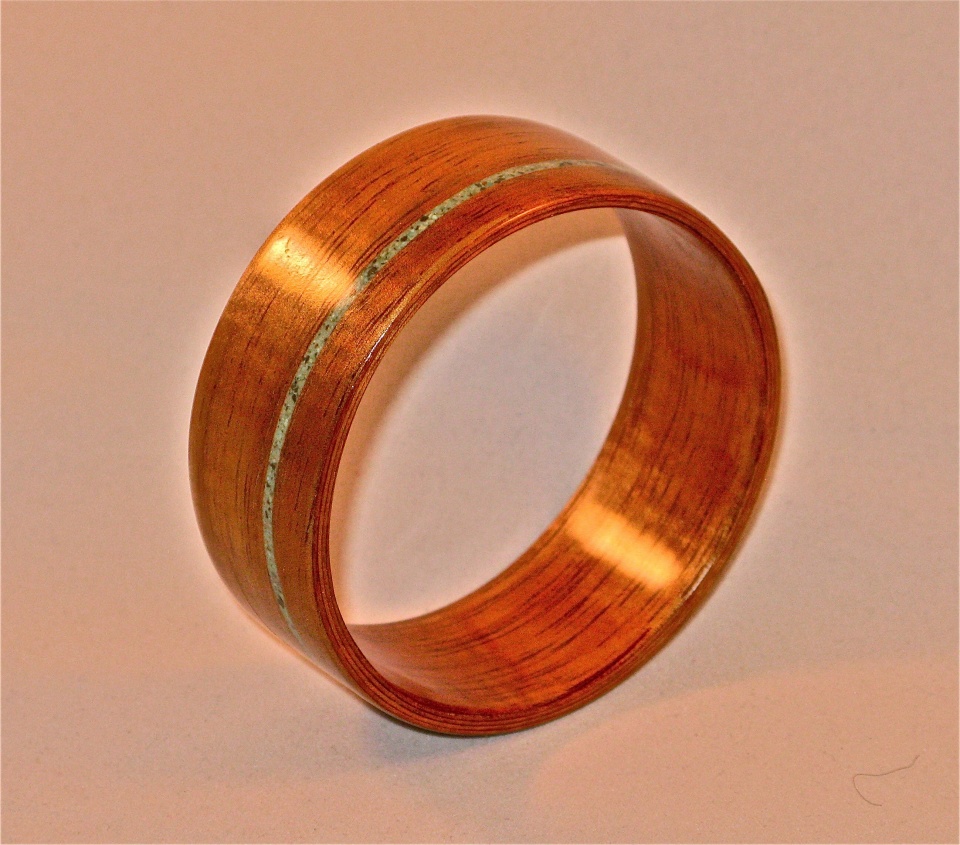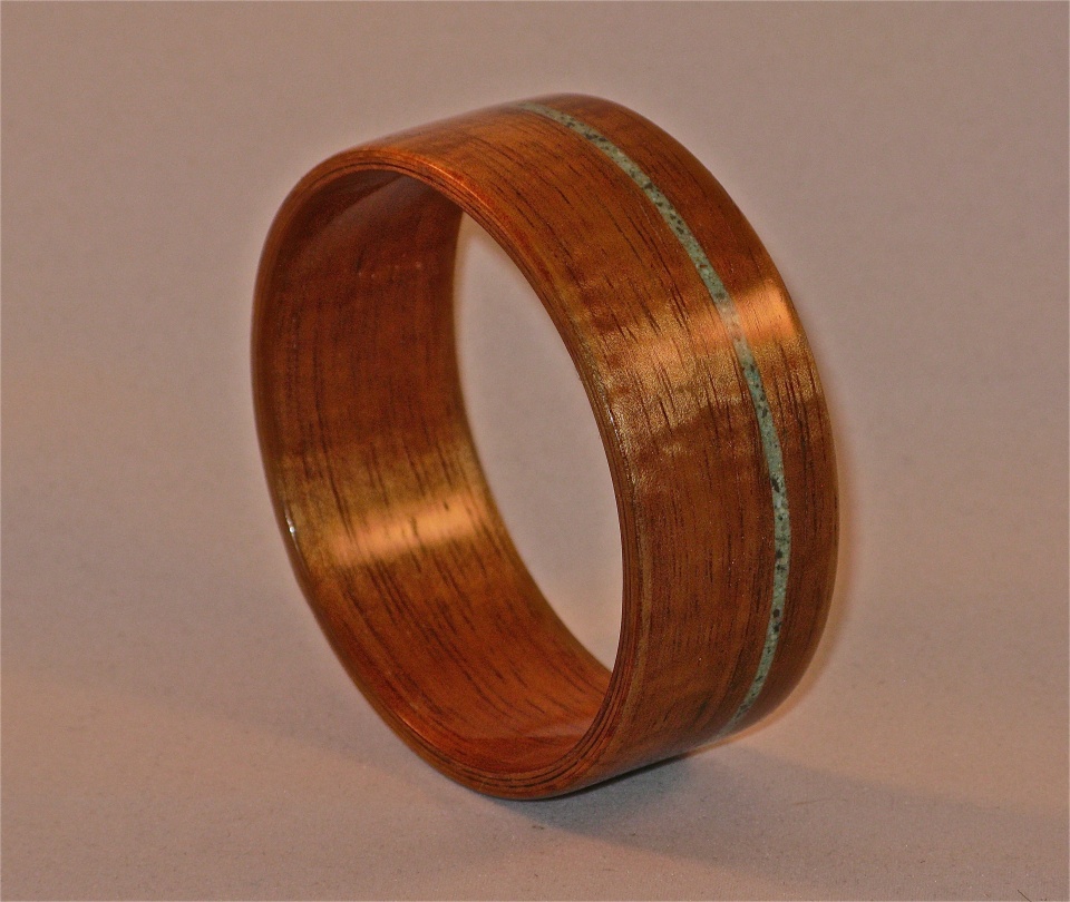 This is a figured Hawaiian Koa Bentwood Bangle featuring an offset crushed turquoise inlay with a CA finish, size 8 (2.5" inside diameter).