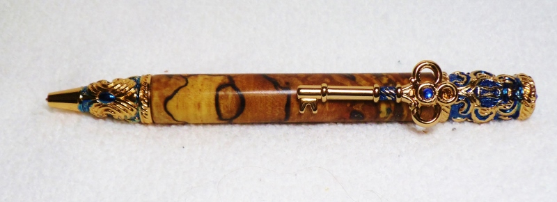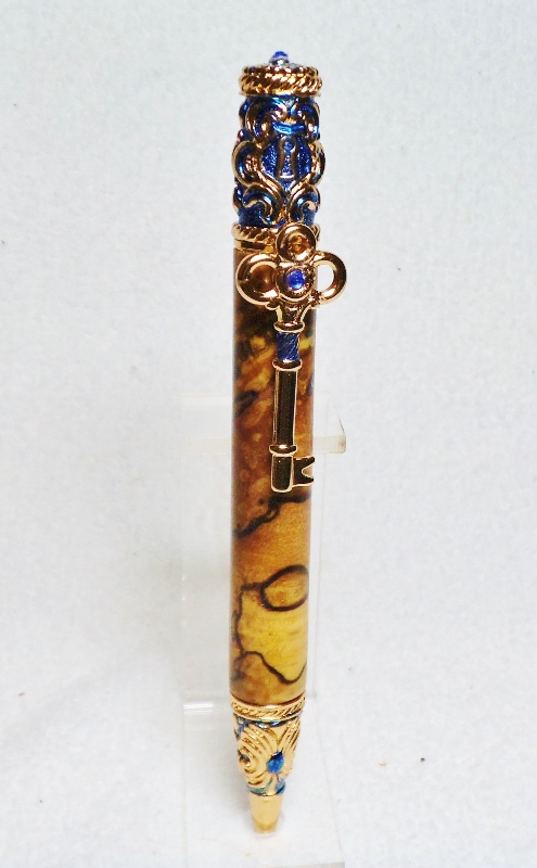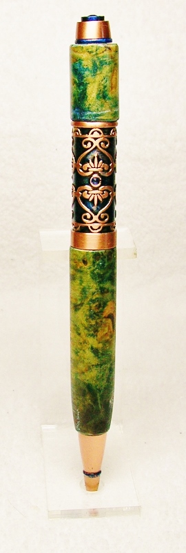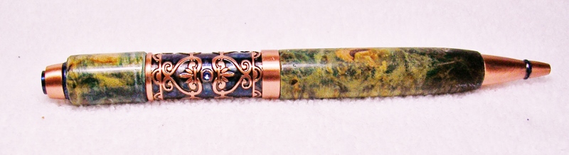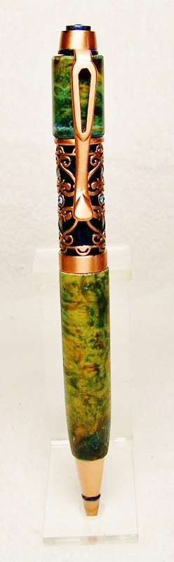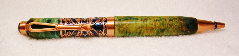 This started out as a PSI Filibella antique copper pen kit. I changed the color of the background and crystals with blue alcohol dye/ink to make the copper design stand out better. The blanks are Birdseye Maple Burl tinted with the same blue alcohol dye/ ink plus a blender to soften the color. With the yellowish grain of the maple and the blue dye, the blanks look more green that blue on the photos. Sanded to 1200 grit and added 8 coats of thick CA. Re-sanded to 1200 and applied Nova #1 and #2 Polish. In my humble outlook this pen kit, without enhancement, is one of the most unflattering in the PSI collection. That is the reason I ordered this kit, to see if I could improve on it's looks. Hope this gives some of you out there ideas of what can be done with it. You can be the judge as to if it improved the look or not. Feel free to blast away !! Jim S