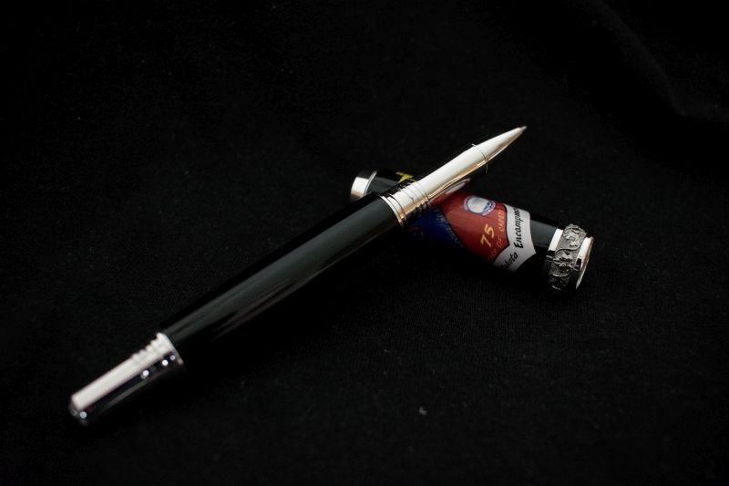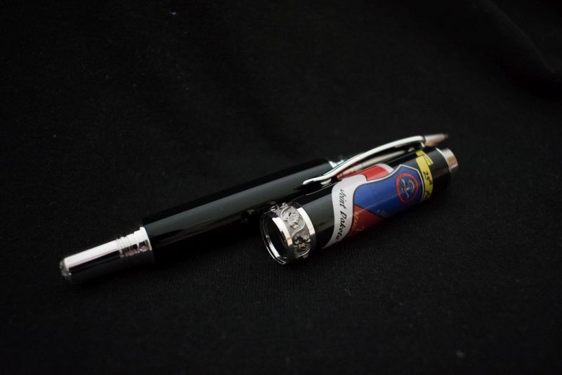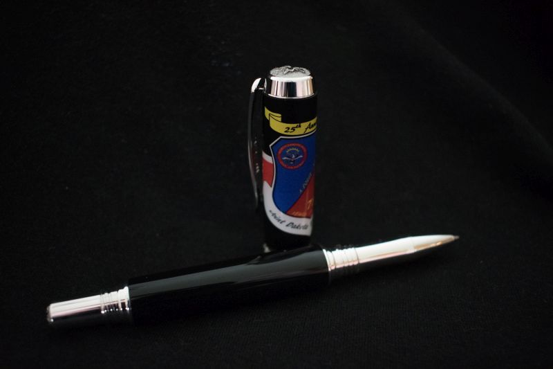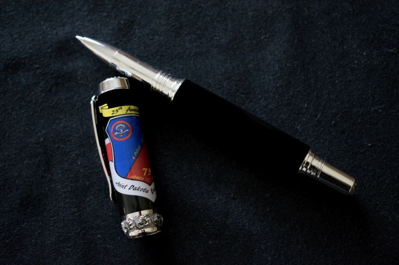 Have only made about 20 pens in the last 2 months or so, Live is running ragged, but this is one of what will probably become a set for several active duty AF and Civil Air Patrol members as a momento from a training exercise from beginning of July. An active duty AF friend (the Commander) and I designed this early this year but I didn't get around to having the blank made. KUDO's to Michelle Ferrara for making the cap blank with the logo. Attached is what the logo actually looks like when not wrapped on a cap.