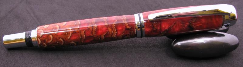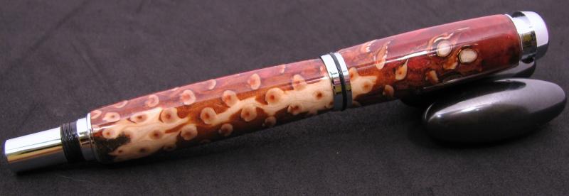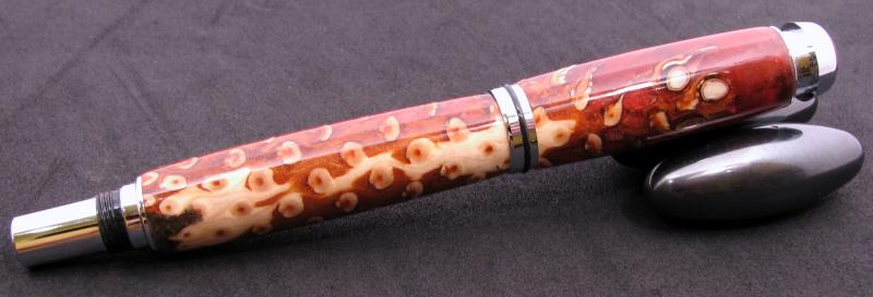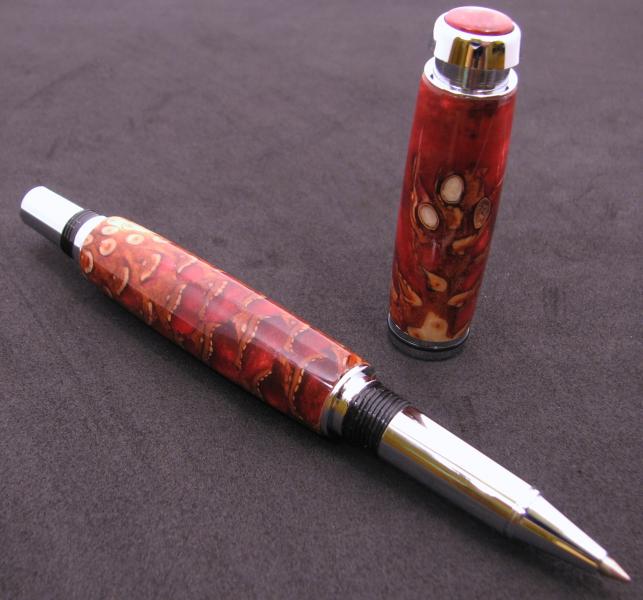 I finally got 1 pine cone pen made after several tries. It was supposed to be a closed end but broke off in the thick part of the cone just past the tube so I threw it in a box and said I was done with cones. Well today I dug it out and sanded to the tube and filled the jagged edge with mica and glue. Not what I hoped for color wise for but it worked. I do not have a pressure pot so these are just cast and hope for the best. I find they are very difficult to turn, just waiting for it to blow up. Any hoo I think it turned out just dandy after all the problems.