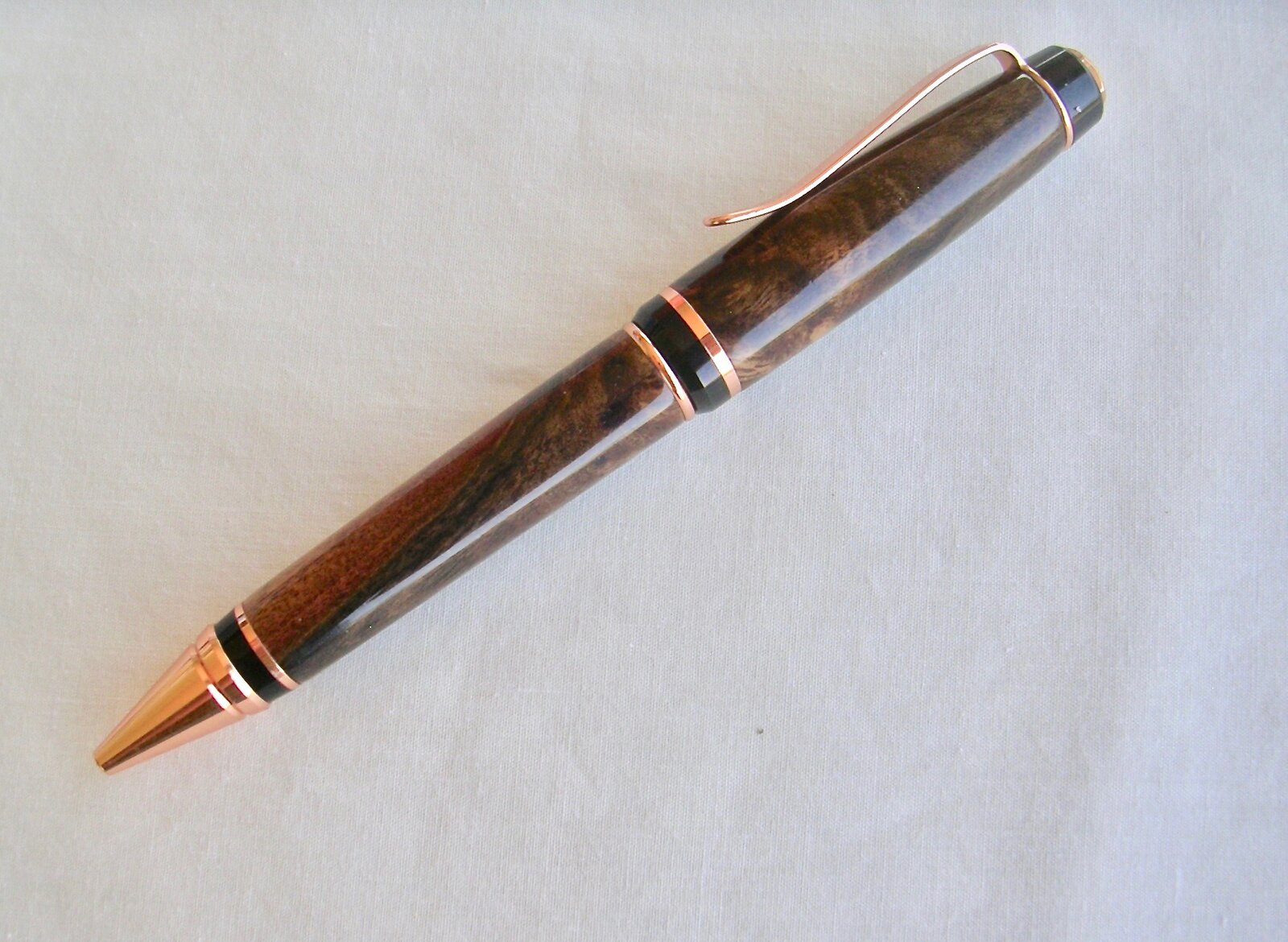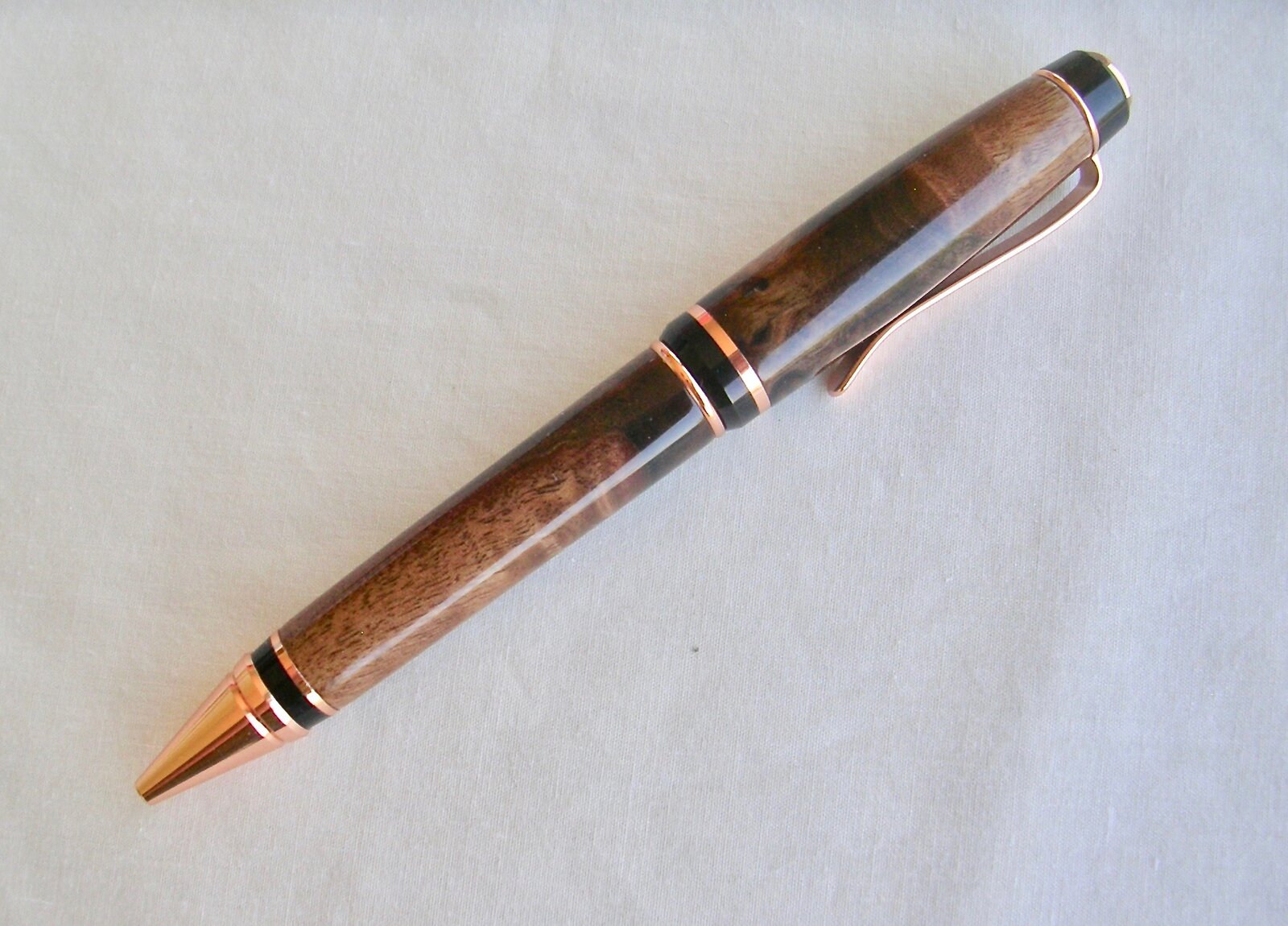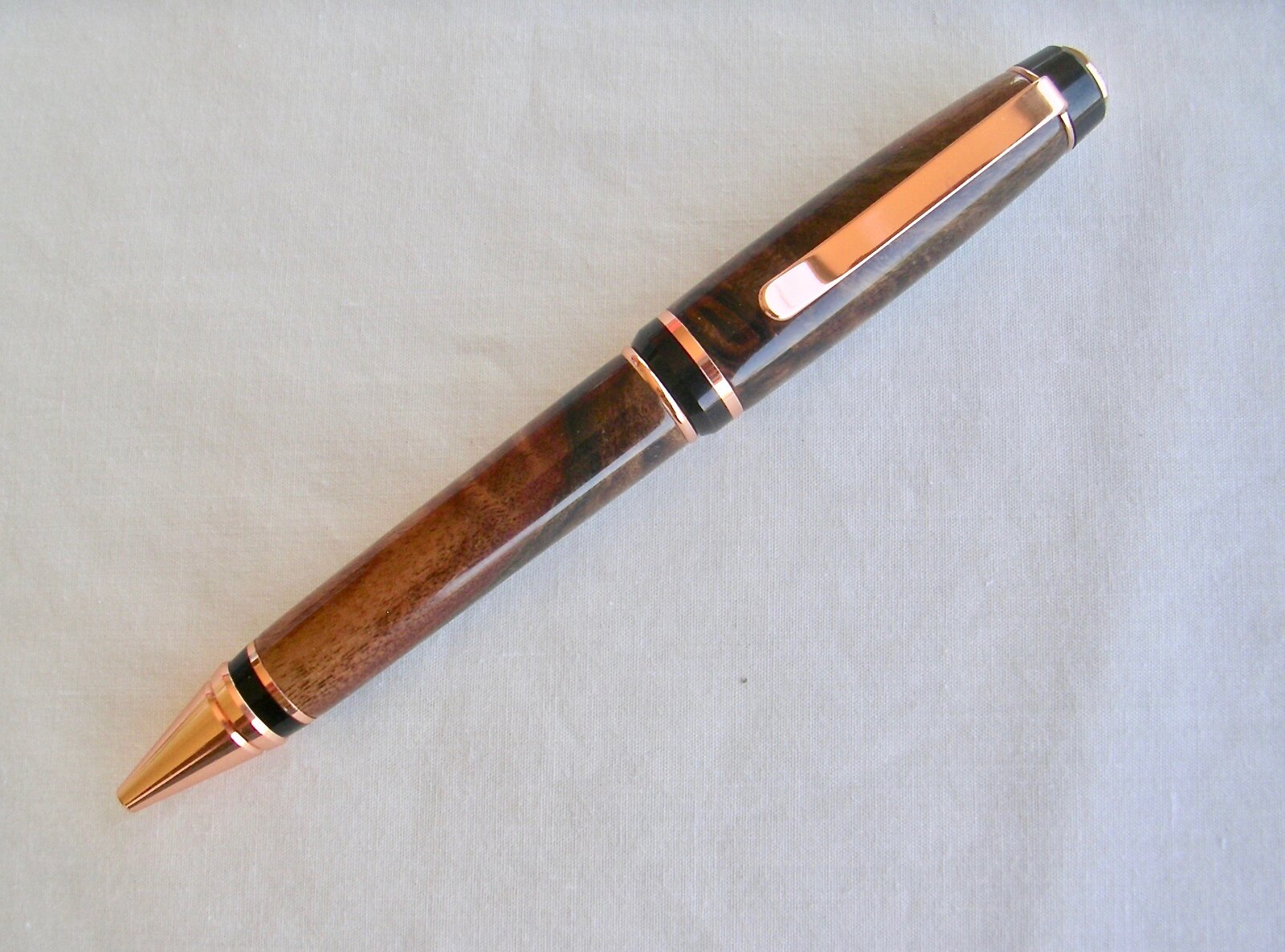 On the Bright Copper Cigar I used some Mimbres Walnut which is a New Mexico species I got from a deadfall in Capitan, NM. It was air dried and has some nice color. This blank had some bug holes I filled . It was an experiment since I have a lot of this material.