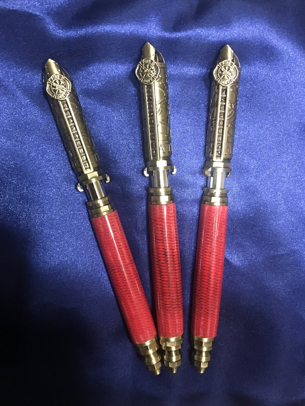 These three wore me out. Between turning and finishing I'm happy I'm done! Most of what I turn are blanks I cast. Therefore I don't use a lot of CA finishes. These are made from real local city fire hoses that were put out of service. The fibers of the hose won't absorb resin, CA or any other glue. So the process is put a layer of CA on the hose and turn it if. Once the glue is gone the hose starts to fray. It took a while to finally get it to size. Then it's been long enough since I've used CA for a finisk I've forgotten how to do it. Anyway here they are ready to be passed out to their new owners. Questions and Comments Welcome.