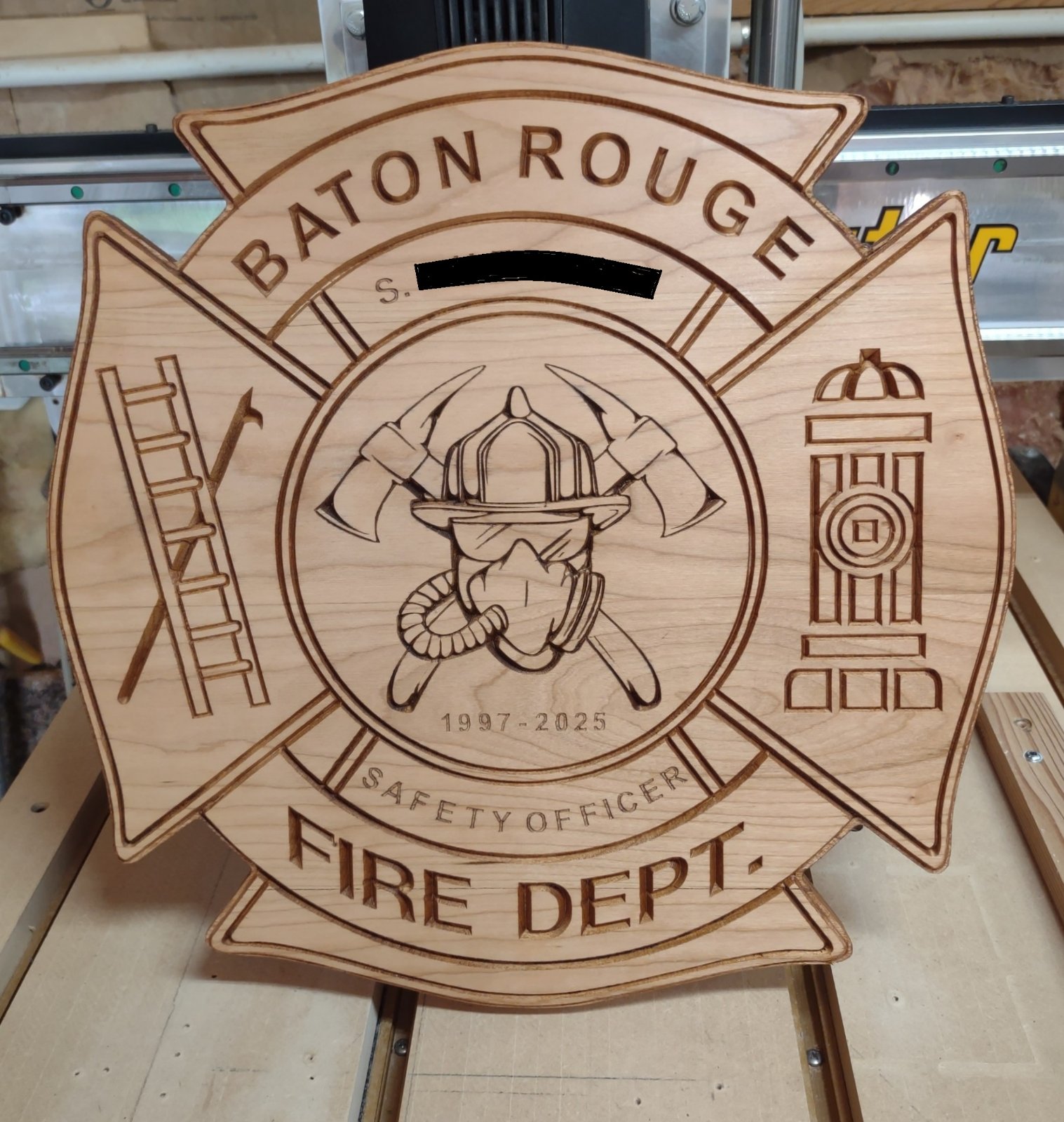 My latest retirement plaque for a Fireman that works with my son. Done on a CNC, wood is Cherry with a spray lacquer finish. Bobby Louisiana