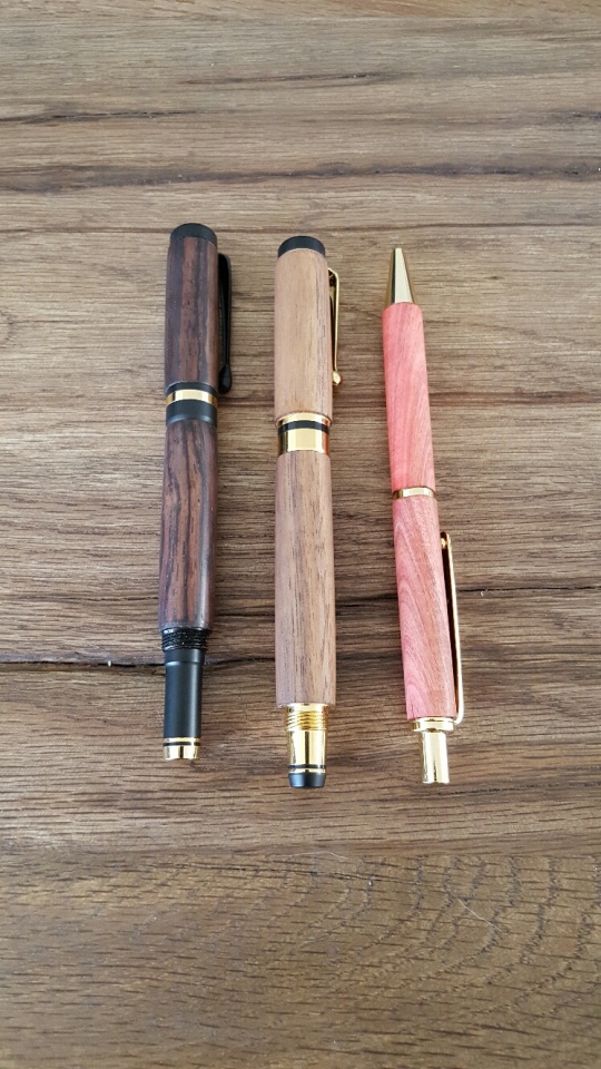 Chris the pens are made of striped ebony, greek walnut and pink ivory.