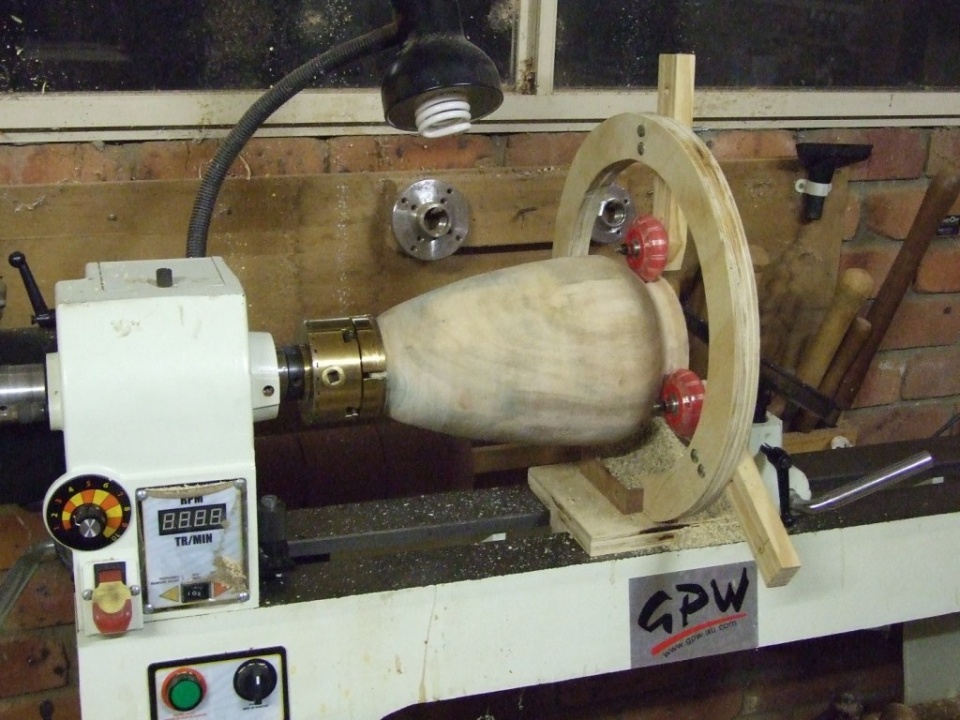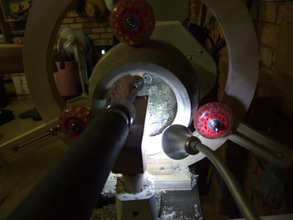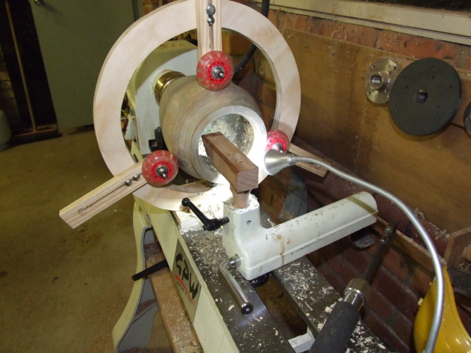 Then I had to stop to make a Steady Rest out of Ply and kids roller-boot wheels.