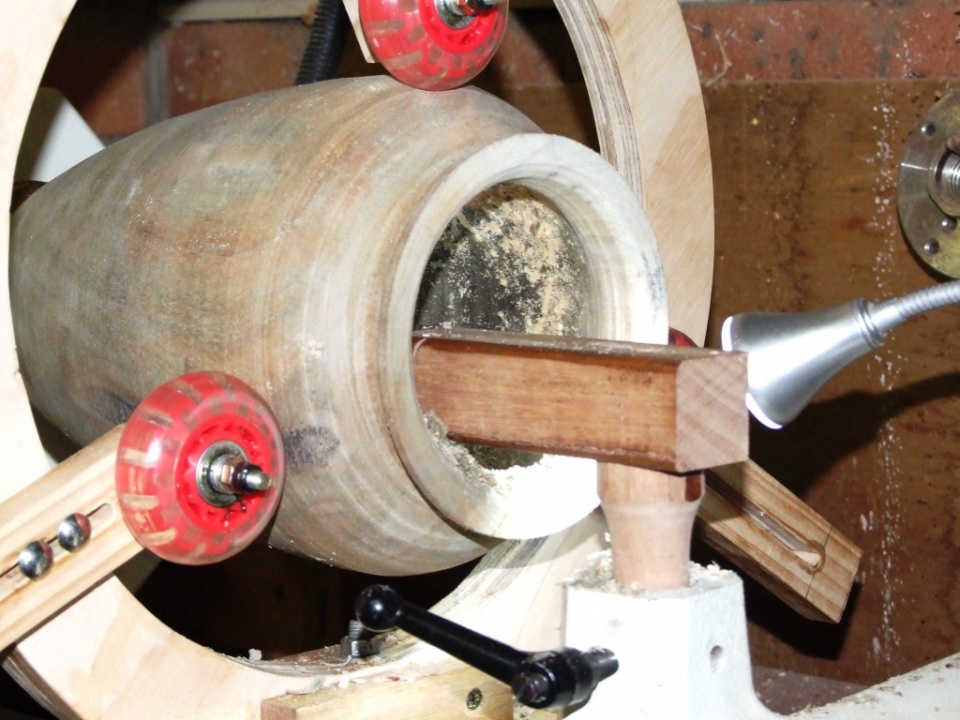 At this point I stopped and made an extended tool rest that reached in to a depth of 5', this helped settle matters down really well and hollowing proceeded ! However after about another 4' inches tool bounce and chatter set in again !!!