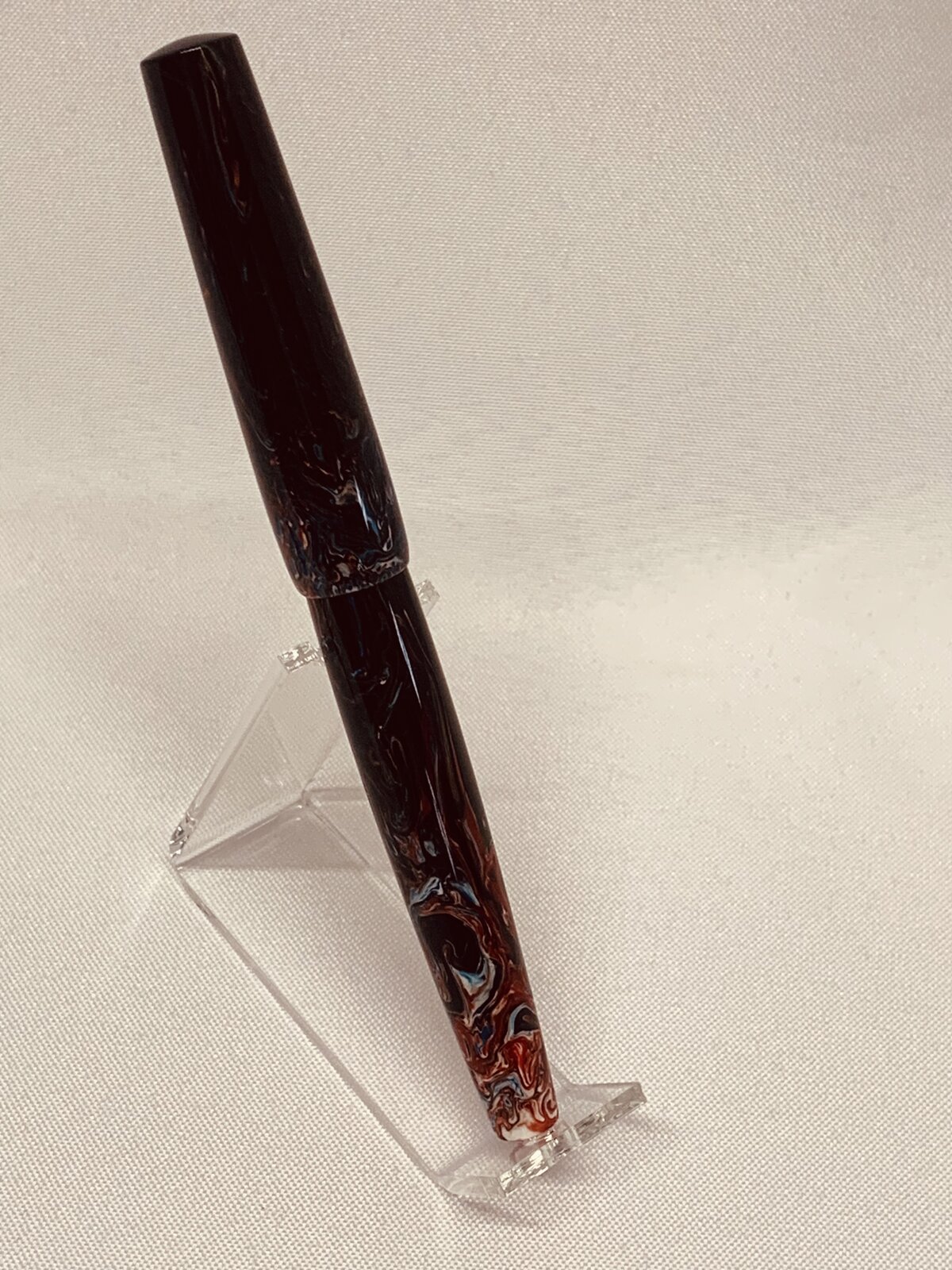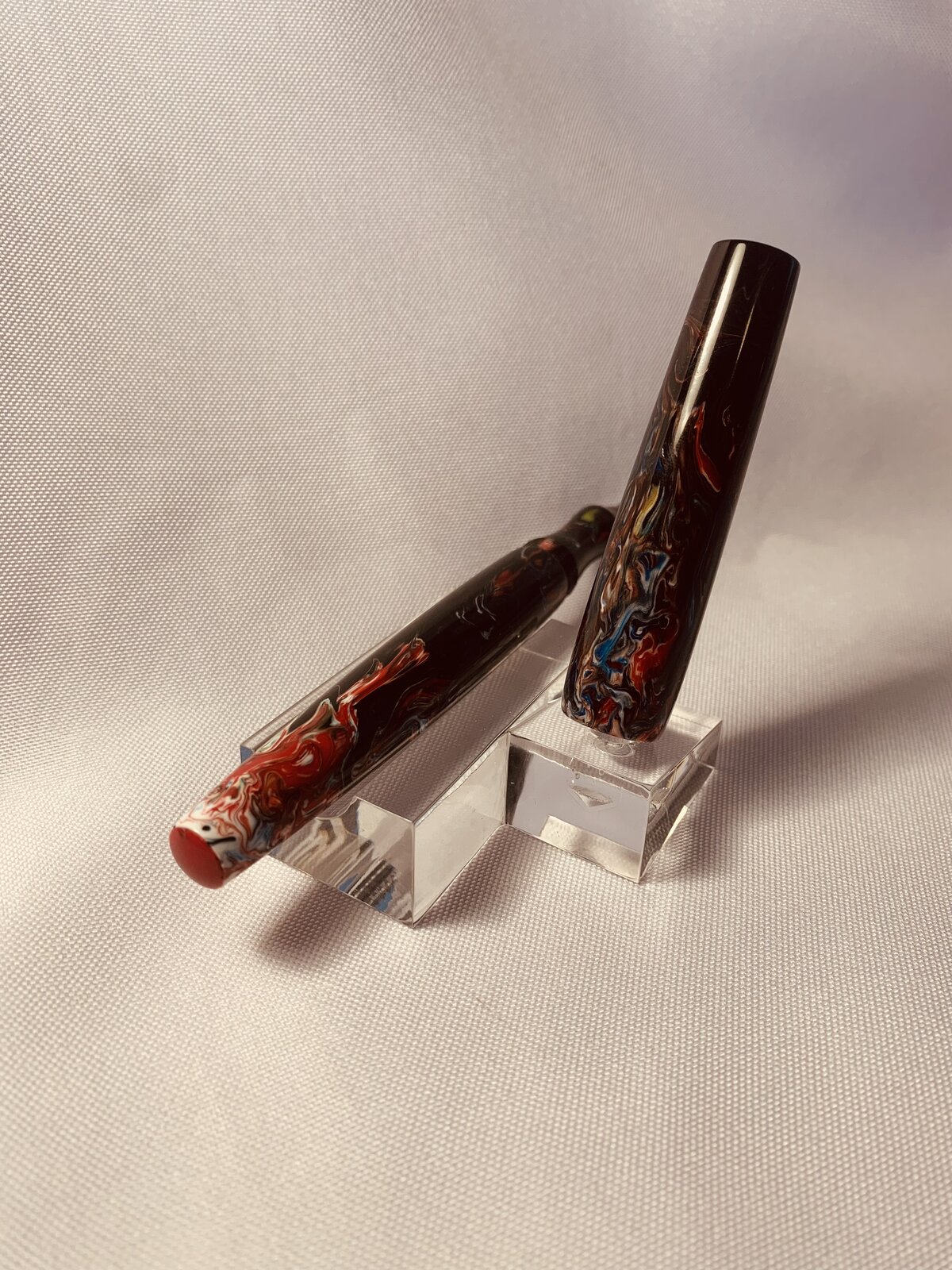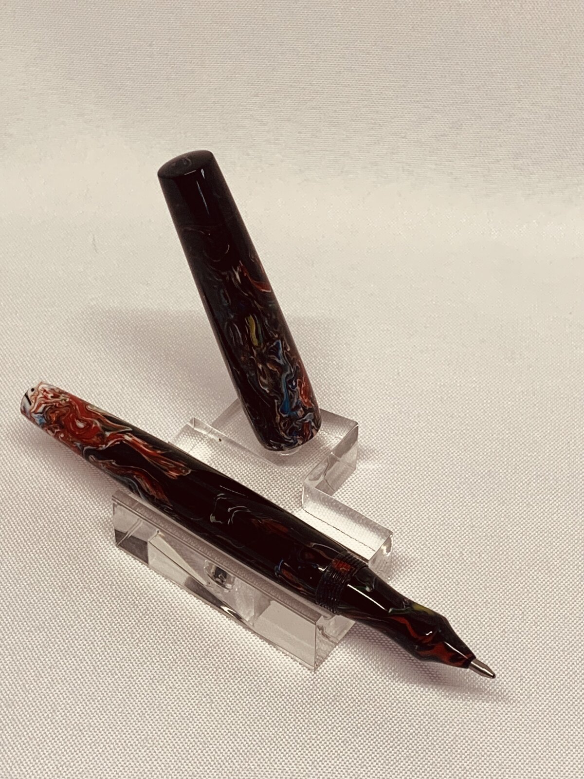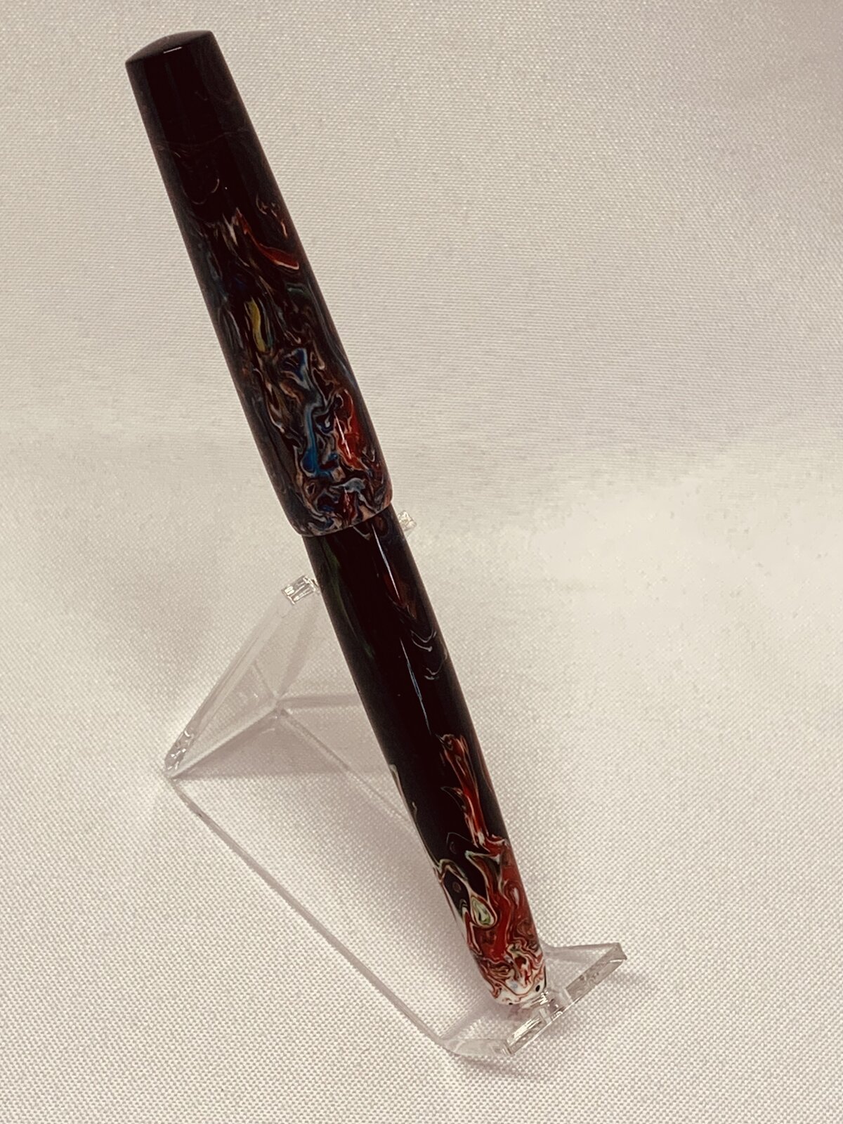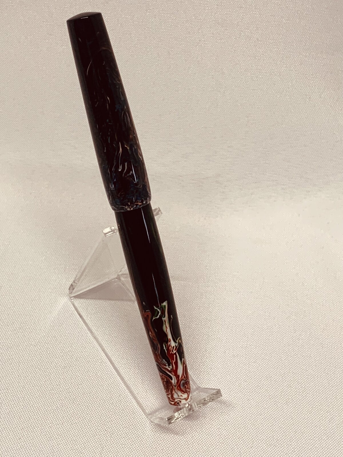 I decided to turn the blanks down anyway and thought I would use them for black caps and finials. I drilled the pilot holes a little deeper than normal (this is another learning experience that will play out later on) because a thought I would be turning scrap material. As I started the turn the blank, multiple colors began to emerge – this is where Bob Ross and his Happy Accidents came out from hiding. At one point I decided to stop and measure how much material I actually had. I found it was just enough material to make a bespoke rollerball pen design I had been working on. After turning and threading I was happy with the result – until I realized I had a deep pilot hole in the end of the body. After considering what options I had, I decided to mix some red PR and see if I could patch the hole. This seemed to work really well. During the polishing stage even more colors and details began to emerge. One thing I wished I had done differently (other than giving up on the blank so quickly) is to pay more attention while sanding around the nose cone of the section. I lost 1 to 2 mm of material which is exposing more of the refill tip than I would like. All-in-all I am happy with the results, and have received many compliments.