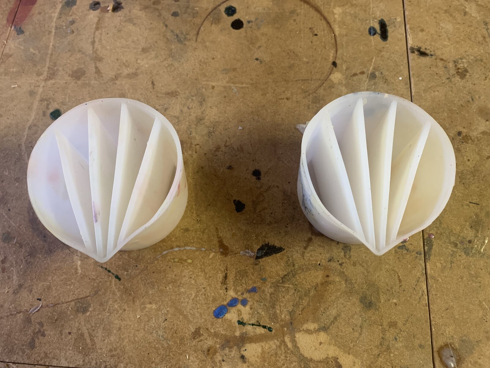 The translucent colors were poured into the matching opaque colors with the hope of creating depth and then poured into two separate divided mixing cups (I included a photo of the cups because I knew I would butcher up the description.) I used every other section for the colored resin and poured clear resin in the sections between the colors (again hoping for some kind of depth and transparency.) I poured both cups into ¾ inch PVC pipe forms. Here was my first learning experience – use a funnel with the mixing cups. I think I ended up with more resin outside the tubes then inside.