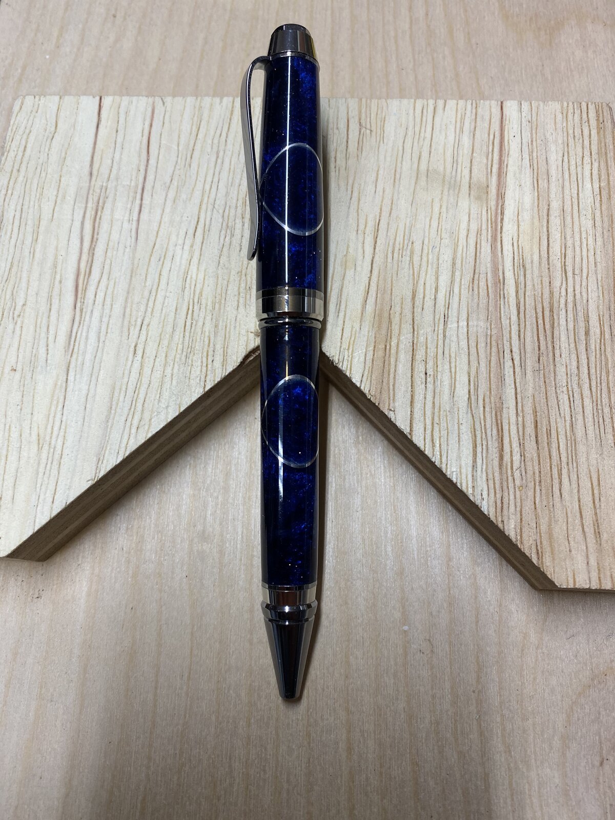 First try at aluminum inlay, pretty slick looking I think but I did accidentally cut a ring in the lower tube just below the transition that was unintended but wife saw it and really liked it so new one for her desk.