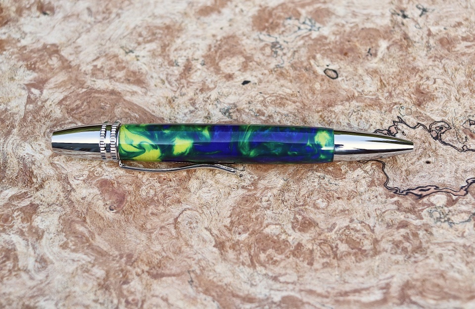 Anyone that has an inquisitive toddler knows they like to be involved. So after much begging on his part, I let my almost 4 year old pick out a couple colors and some pearlex to go with them. He REALLY wanted blue and yellow so we mixed them at the ratios he dictated and then I held the cups steady while he poured them in. After that I kicked him out of the garage while I turned on the pressure pot. (I use safe pressure but, mechanical things can and do fail right?) He wanted the same pen kit as momma but we went with chrome hardware instead. Meanwhile daddy learned just how clear the yellow pigments are when used with Alumilite clear. Might be time to get some white alumilite...